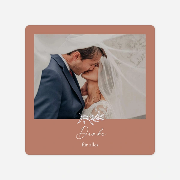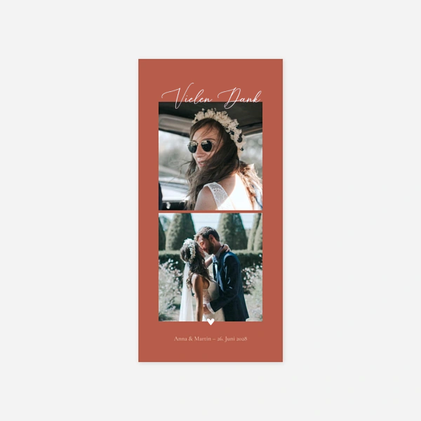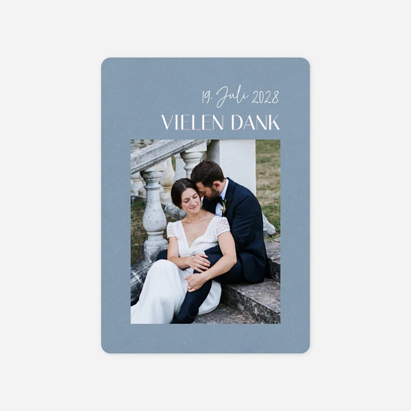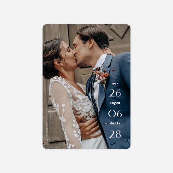 Nach den Festlichkeiten ist die Zeit gekommen, sich bei den vielen Hochzeitsgästen mit einer Dankeskarte, am besten passend zur Hochzeitseinladung, zu bedanken. Ohne Ihre engsten Freunde und Verwandte wäre Ihre Hochzeit nicht so schön gewesen. Seit Monaten sind sie für Sie da, helfen, wo sie können, damit an Ihrem großen Tag alles perfekt ist. Und all Ihre Gäste, die Sie so großzügig beschenkt haben und Sie den ganzen Tag mit liebevollen Worten und Gesten begleitet haben, sollen nun wunderschöne Dankeskarten von der Hochzeit erhalten, eine Erinnerung an diesen unvergesslichen Tag. Wenn Sie schon Ihre Hochzeitseinladungen bei Atelier Rosemood bestellt hatten, wissen Sie schon, wie schnell und leicht es ist, Ihre Karten selbst zu gestalten. Da während Ihrer Hochzeit viele Fotos geschossen worden sind, haben Sie bestimmt schon die schönsten davon ausgewählt. Je nach Kartendesign können Sie ein oder mehrere Fotos wählen, die Sie in Ihrem Kundenkonto hochladen können. Machen Sie sich um die Qualität Ihrer Hochzeitsfotos keine Sorge - wir kümmern uns darum und überprüfen alles!