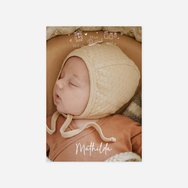 Gestalten Sie die perfekte Grußkarte zur Geburt passend für Ihr Baby! Unsere begabten Designer haben immer wieder tolle und innovative Ideen für Geburtskarten. Wie wäre es mit einer Geburtskarte mit Piktogrammen, so sehen Ihre Liebsten alle wichtigen Informationen auf einen Blick. Eine andere Idee wäre eine Geburtskarte im Kraftpapierton. Eine schöne Idee ist es immer, die Karte zur Geburt mit einem Foto Ihres Babys zu personalisieren. So lernen Ihre Freunde und Familie den Neuankömmling direkt kennen.