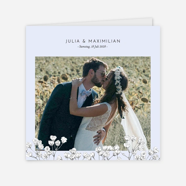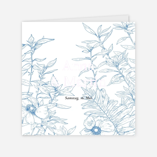 Blaue Hochzeitseinladungen bieten zahlreiche gestalterische Möglichkeiten: Florale Motive, Aquarell-Elemente oder feine grafische Linien lassen sich wunderbar mit Blautönen kombinieren. Auch schlichte Designs mit klarer Typografie gewinnen durch blaue Akzente an Tiefe und Charakter. Ob verspielt, modern oder klassisch – Blau passt sich Ihrem Stil an und unterstreicht ihn auf natürliche Weise.