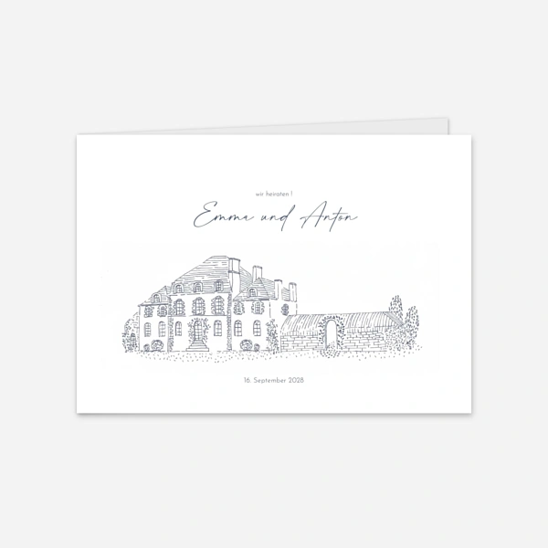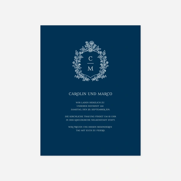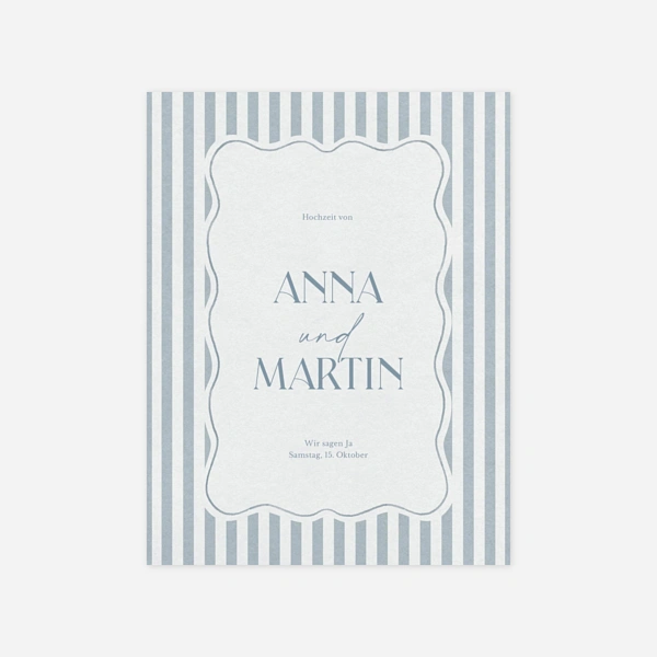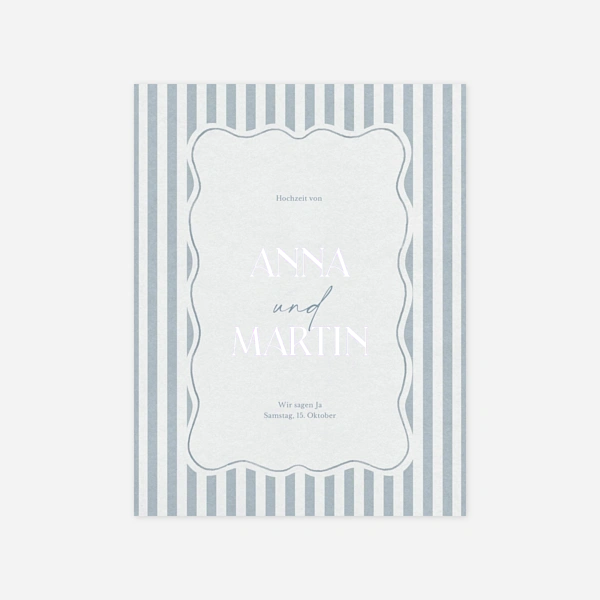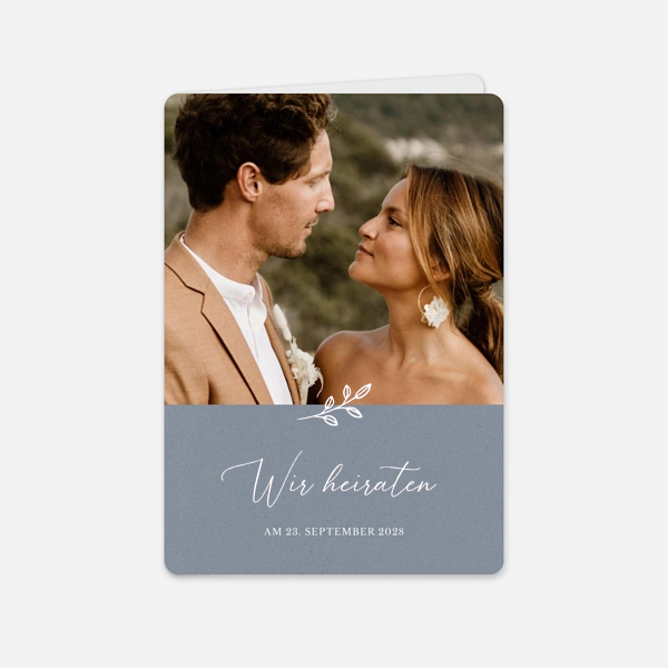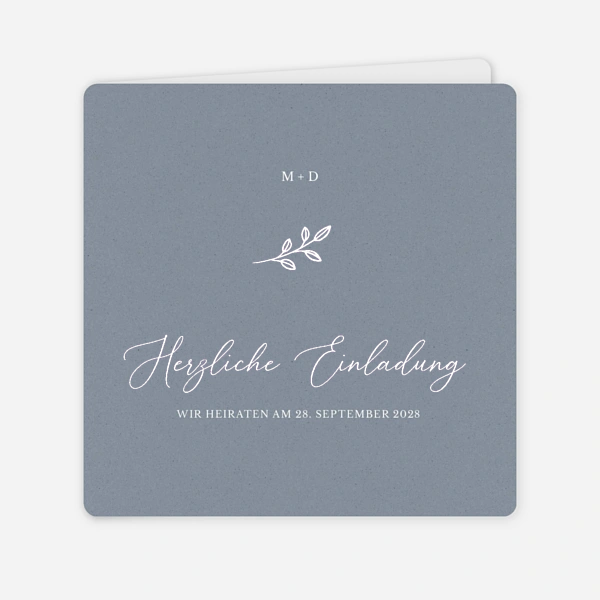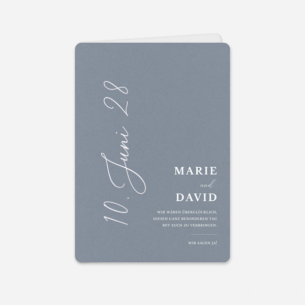 Blau symbolisiert Vertrauen, Beständigkeit und Harmonie – Werte, die eng mit der Ehe verbunden sind. Zugleich wirkt die Farbe edel und zurückhaltend. Von zartem Pastellblau über staubige Nuancen bis hin zu tiefem Navy oder Mitternachtsblau: Jede Farbvariante erzeugt eine eigene Stimmung. So eignen sich helle Blautöne besonders für sommerliche oder minimalistische Hochzeiten, während dunklere Töne eine elegante, fast majestätische Wirkung entfalten. Unser Tipp: Mit einer Goldprägung kommen dunkelblaue Farbtöne besonders schön zur Geltung.