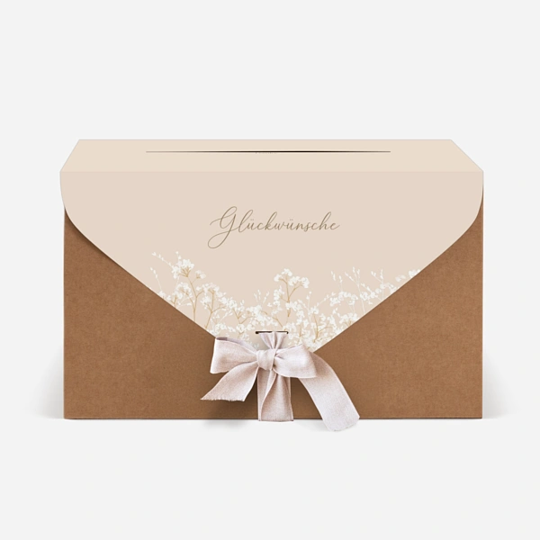 Die Kartenbox zur Hochzeit ist viel mehr als nur eine einfache Schachtel: Durch ihren Einwurfschlitz werden Briefe oder Karten einfach hineingeworfen wie in einen Briefkasten. Nachdem sie ihre Aufgabe als Briefbox bei Ihrer Hochzeit erfüllt hat, wird sie zum dekorativen Aufbewahrungsort für all die guten Wünsche, die liebevollen Zeilen und kleine Erinnerungen an den großen Tag. Falls Sie sich von Freunden und Familie einen finanziellen Beitrag gewünscht haben, eignet sie sich auch perfekt als stilvolle Geschenkbox: Wer zur Hochzeit Geld überreichen möchte, kann es hier diskret deponieren. Die Box wird mit einer dekorativen Schleife verschlossen, sodass der Inhalt vor neugierigen Blicken geschützt bleibt.