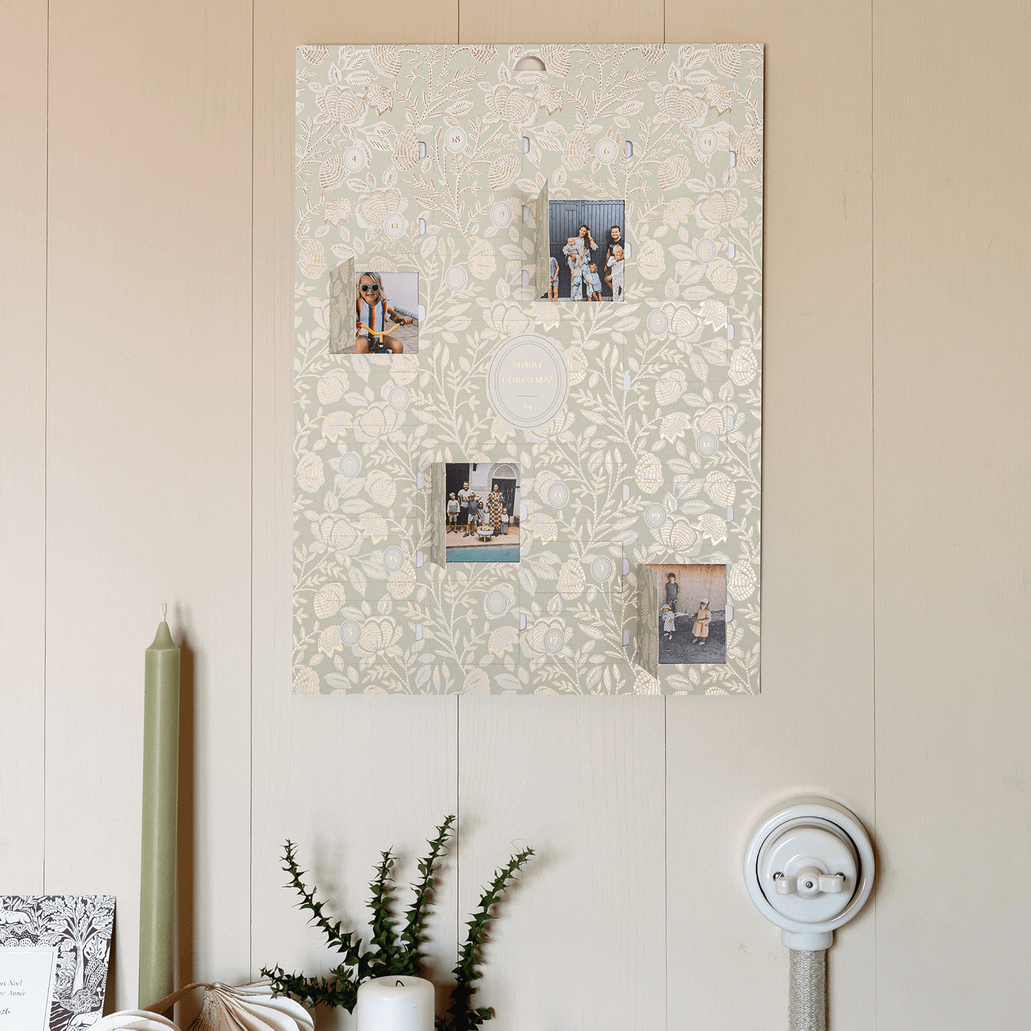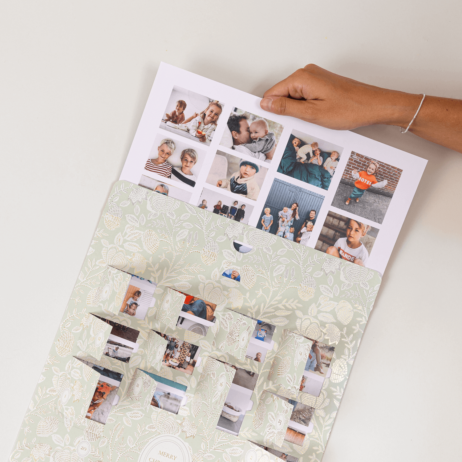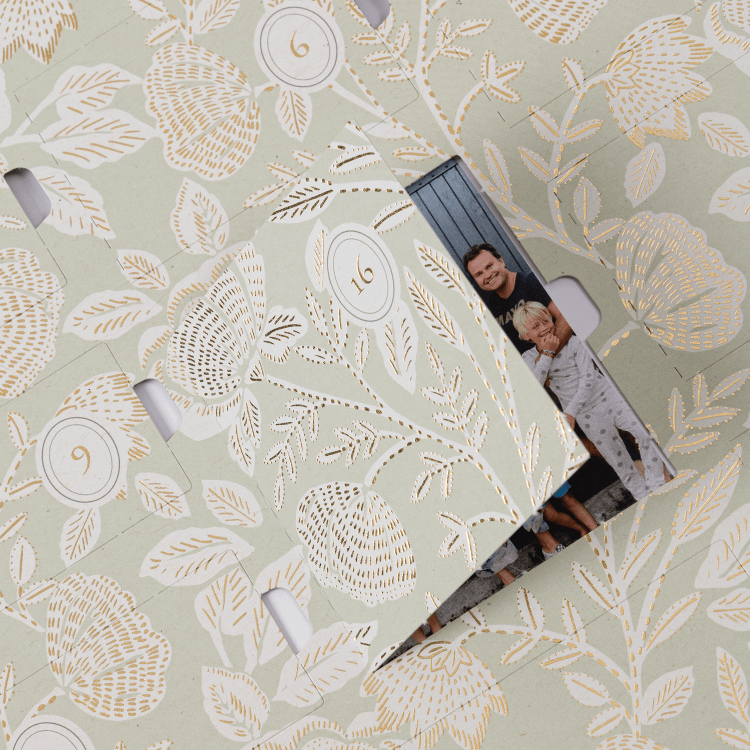 Versüßen Sie sich die Wartezeit bis Weihnachten mit der stillen Eleganz unseres Adventskalenders "Dezemberblüte". Ein filigranes, florales Muster, veredelt mit feiner Goldfolie, rankt sich über das dezente Design und verleiht ihm eine zeitlos festliche Anmutung. Hinter jedem der unauffällig in das Muster integrierten Türchen verbirgt sich ein Platz für Ihre liebsten Foto-Erinnerungen.