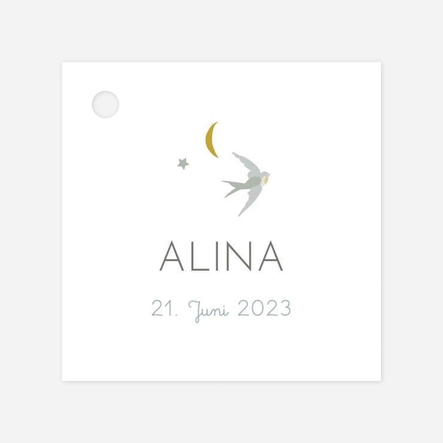 Sie möchten Ihren Gastgeschenken den letzten Schliff verleihen? Dann können Sie das mit unserem Aufkleber Taufe Gastgeschenke Wolkenreich tun. Entscheiden Sie sich zwischen den zwei wunderschönen Farbvarianten und beginnen Sie mit der Gestaltung Ihrer Aufkleber in unserem Online-Editor. Hier können Sie den Text Ihrer Wahl einsetzen und außerdem von der Schriftart bis hin zur Schriftgröße alles ganz nach Ihrem Geschmack anpassen. Falls Sie Fragen zu unserem Gestaltungstool haben, können Sie unseren freundlichen Kundenservice jederzeit per E-Mail, Chat oder Telefon erreichen. Neben dem Textfeld finden Sie eine schwebende Schwalbe, die sich elegant durch den Abendhimmel bewegt. Daneben finden Sie die Zeichnung eines Mondes und ein Sternchen.