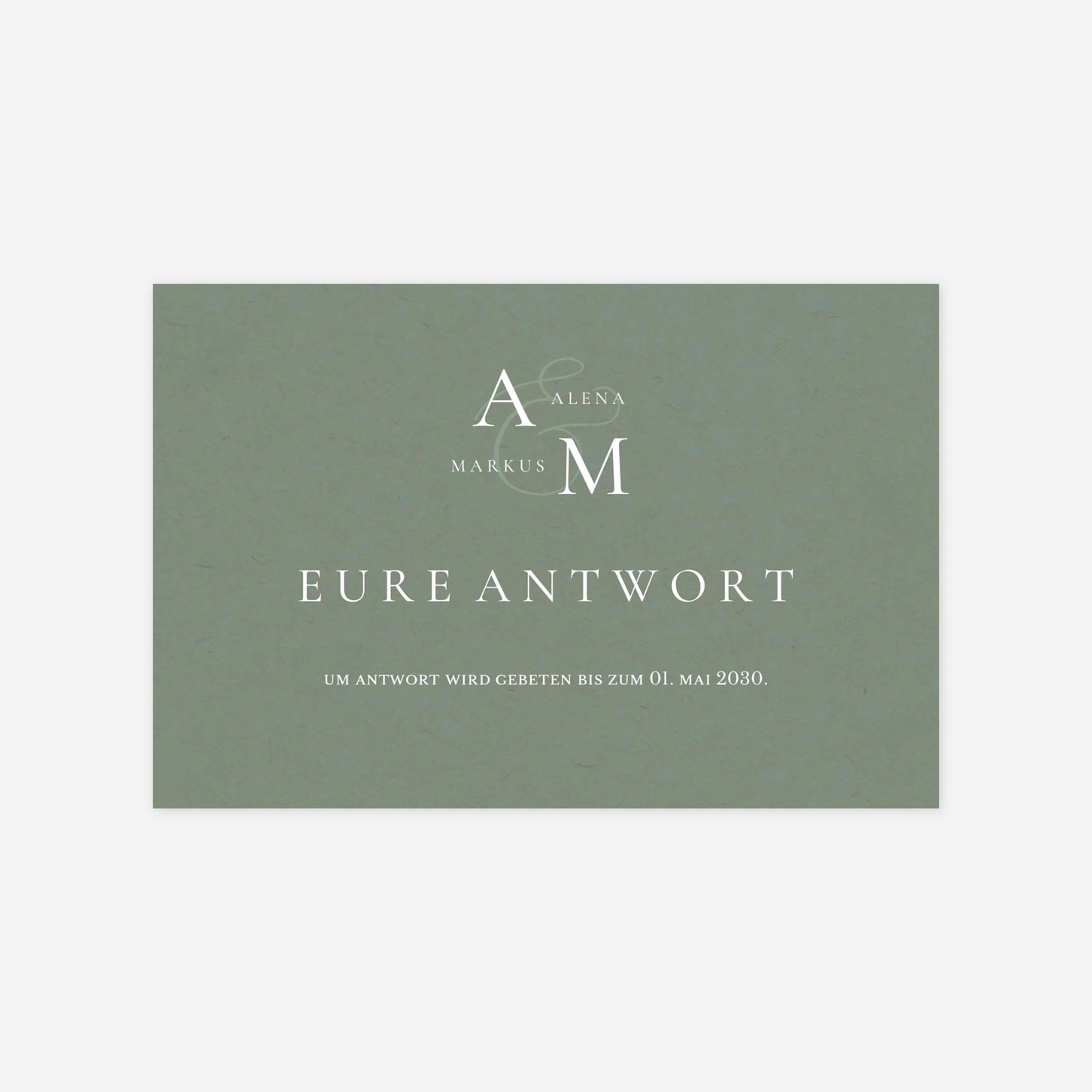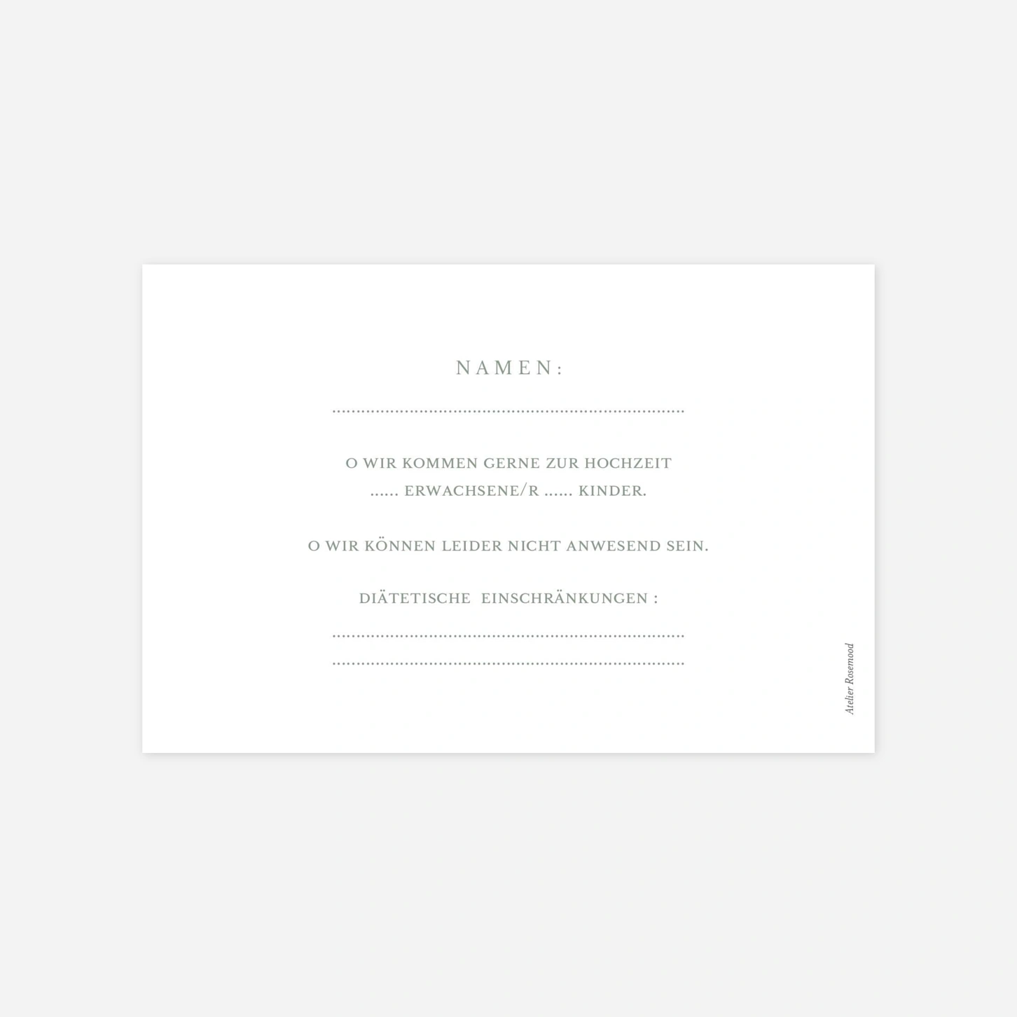 Erleichtern Sie die Organisation Ihres großen Tages mit der Antwortkarte "Sanfte Zweisamkeit". Sie wird Ihrer Einladung beigelegt und ermöglicht Ihren Gästen eine unkomplizierte Rückmeldung zu ihrer Teilnahme.