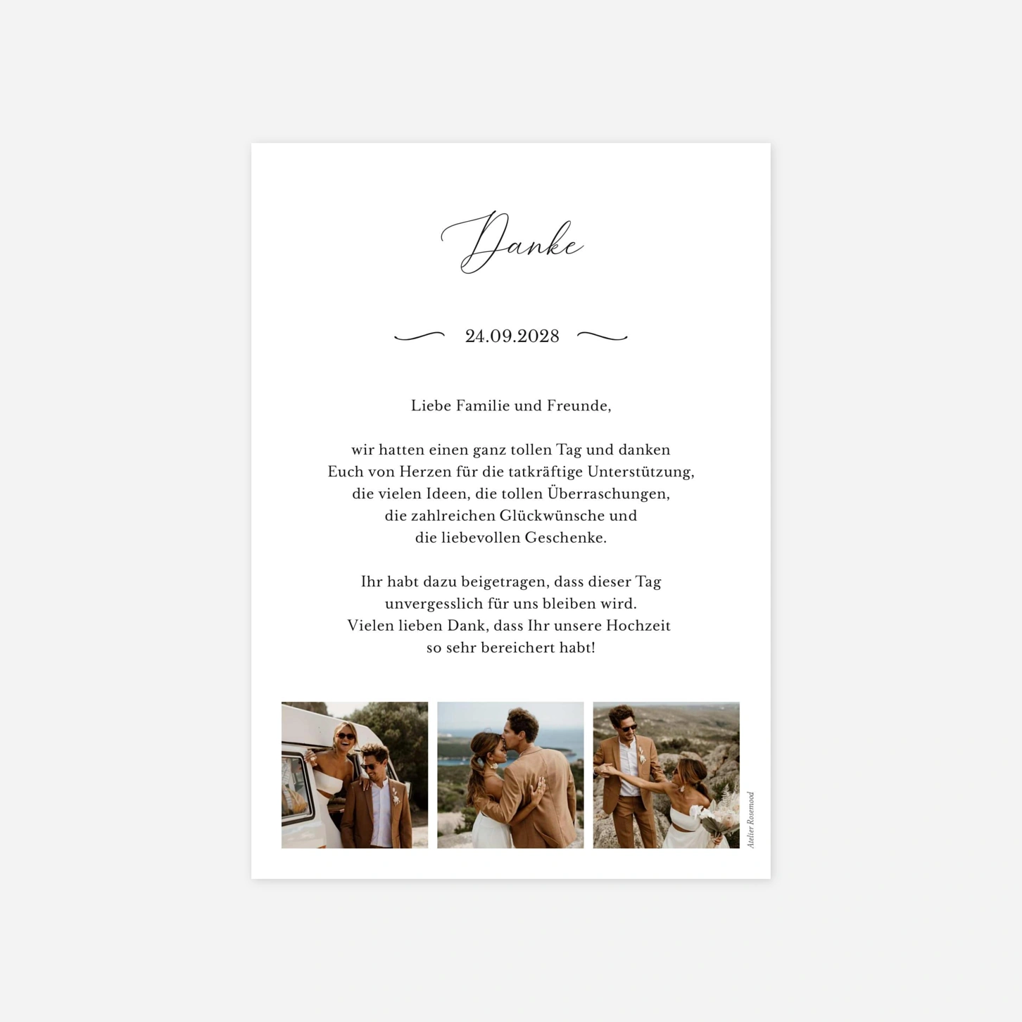 Die Dankeskarte Hochzeit "Ewige Zweisamkeit" bietet den perfekten Rahmen, um Ihre tiefste Dankbarkeit für einen unvergesslichen Tag zum Ausdruck zu bringen. Mit ihrem großzügigen Layout setzt diese Karte Ihre schönsten Hochzeitsfotos gefühlvoll in den Mittelpunkt und lässt Ihre Gäste noch einmal in die romantische Atmosphäre eintauchen. Jedes Design wird in unseren hauseigenen Ateliers mit viel Liebe zum Detail für Sie entworfen und auf erstklassigen Papieren gedruckt. Vertrauen Sie auf unsere Expertise und Präzision, wenn Sie Ihre individuelle Dankeskarte gestalten und damit eine bleibende Erinnerung für Ihre Liebsten schaffen. Gestalten Sie Ihr persönliches Kartenset jetzt ganz einfach online.