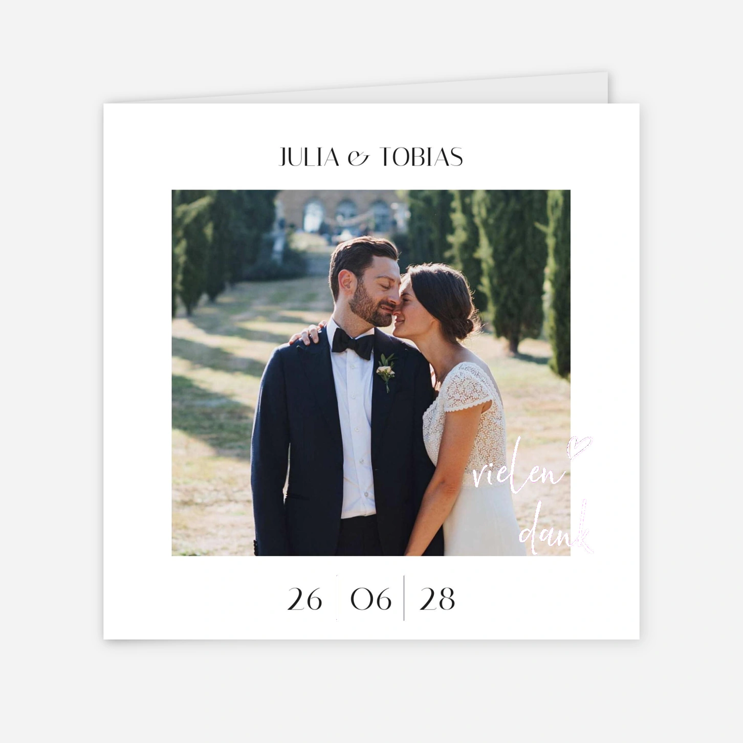 Sagen Sie Ihren Liebsten auf besonders stilvolle Weise Danke mit der Hochzeitsdankeskarte "Grateful Hearts". Das moderne Design stellt Ihr liebstes Hochzeitsfoto in den Mittelpunkt und verleiht Ihrer Dankbotschaft durch die spielerische Typografie eine ganz persönliche Note. Damit Sie sich von unserer Qualität überzeugen können, senden wir Ihnen vorab gerne ein kostenloses Muster Ihrer Karte zu. Jedes Exemplar wird mit größter Sorgfalt in unseren hauseigenen Ateliers für Sie gefertigt. Gestalten Sie Ihre Danksagungen nach der Hochzeit jetzt ganz einfach online.