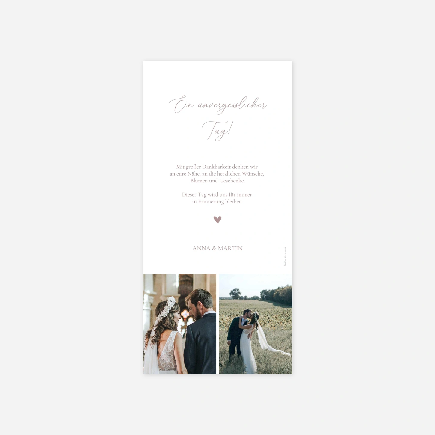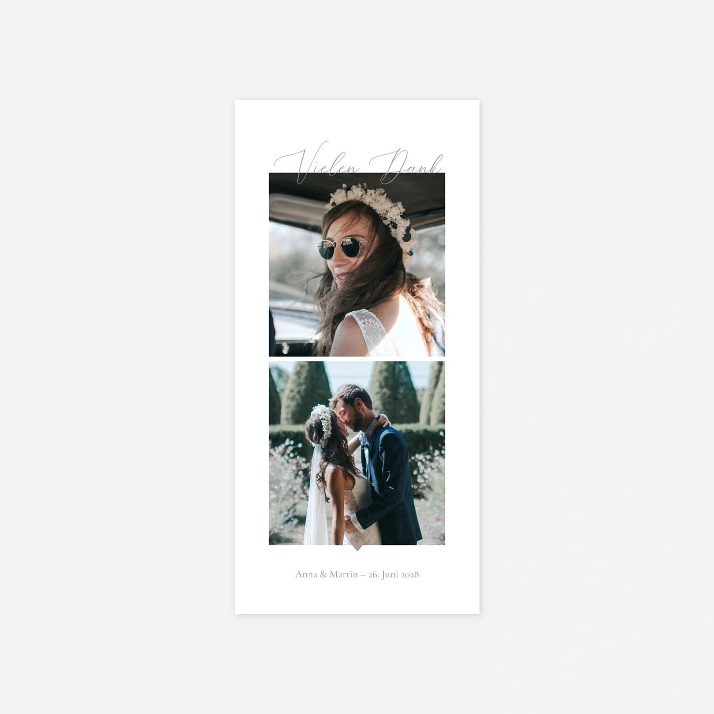 Sagen Sie Danke mit der Dankeskarte "In Harmonie" – liebevoll gestaltet und mit Platz für Ihre schönsten Fotos wird sie zur bleibenden Erinnerung an einen einzigartigen Tag.