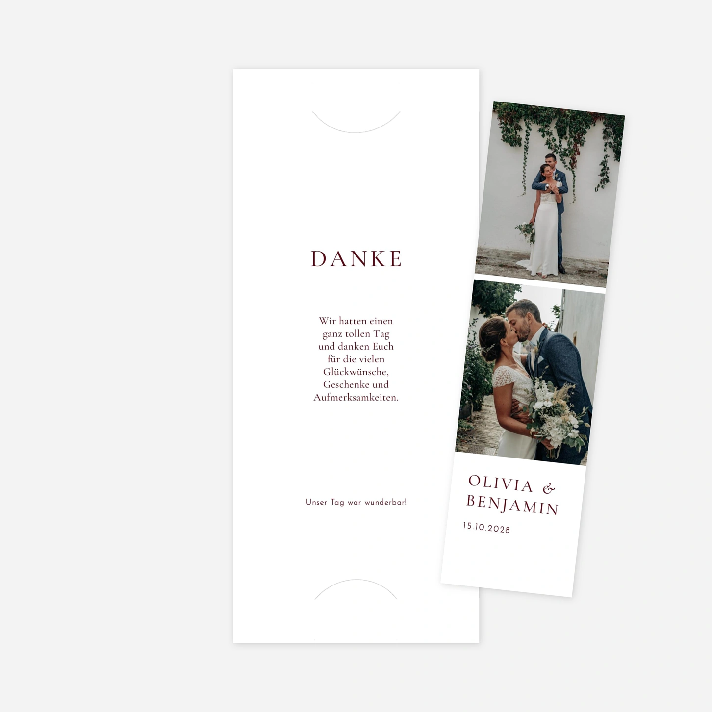 Bedanken Sie sich bei Ihren Liebsten für das wunderschöne Hochzeitsfest mit der Dankeskarte Hochzeit Laure de Sagazan II. Die klassische Dankeskarte Hochzeit stammt aus der zweiten exklusiven Kollektion von Laure de Sagazan und verzaubert uns mit einem Mix aus zeitloser Eleganz und modernen Schriftzügen. Entscheiden Sie sich zunächst zwischen der grünen oder roten Farbvariante, bevor Sie sich an die Personalisierung Ihrer Dankeskarten Hochzeit Laure de Sagazan II machen. In unserem intuitiven Online-Editor finden Sie verschiedene Tools, um die Karte ganz nach Ihren Wünschen zu gestalten. Auf der Rückseite haben Sie Platz für eins Ihrer Lieblingsfoto von der großen Feier. Wir bei Rosemood setzen uns für einen nachhaltigen Umgang mit Papier-Ressourcen ein. Deshalb wurde die Kollektion Laure de Sagazan II so konzipiert, dass die Designs besonders gut auf unserem nachhaltigen Recyclingpapier zur Geltung kommen. Natürlich können Sie sich auch für eine andere Papiersorte entscheiden. Für alle Fragen steht Ihnen unser freundlicher Kundenservice natürlich wie immer gerne per E-Mail, Chat oder Telefon zur Verfügung.