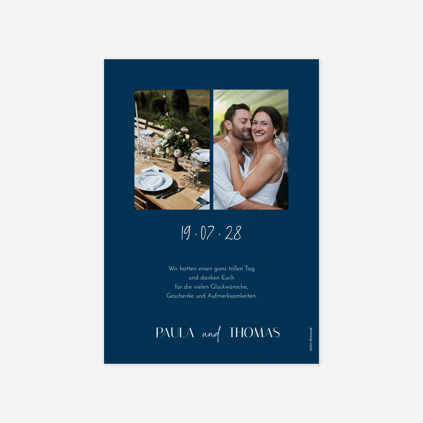 Sagen Sie Danke mit der Dankeskarte "Liebesrausch" – liebevoll gestaltet und mit Platz für Ihre schönsten Fotos wird sie zur bleibenden Erinnerung an einen einzigartigen Tag.