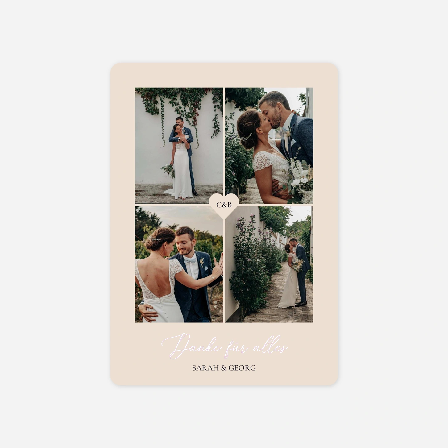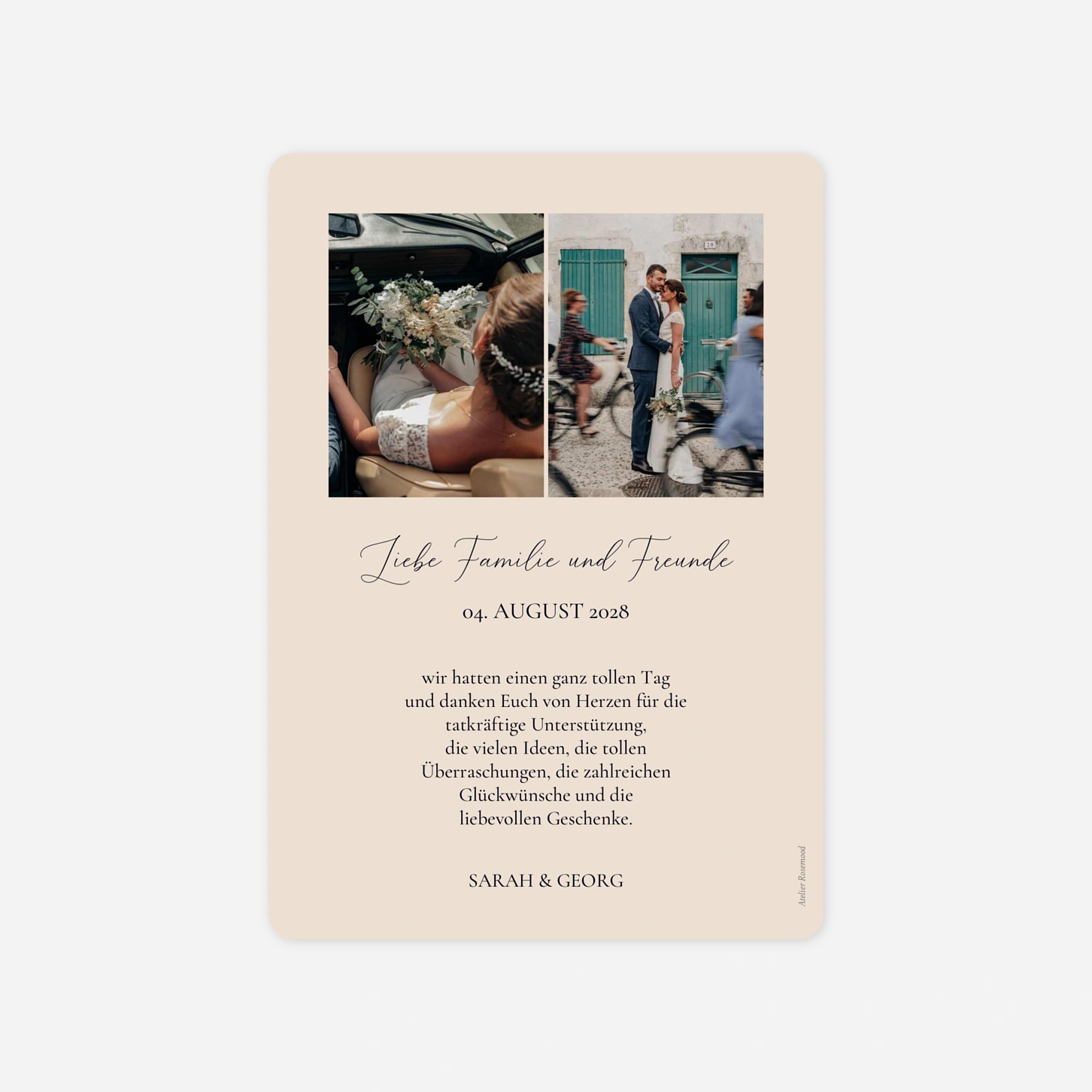Die Hochzeitsdanksagung „Liebevolle Zeilen“ vereint emotionale Bildmomente mit einer klaren, eleganten Gestaltung und gibt Ihren Erinnerungen den Raum, den sie verdienen. Als Wedding Danke HD ist sie ideal, um sich nach dem großen Tag persönlich zu bedanken und Ihre Dankeskarte zur Hochzeit gestalten zu können. Das Design wurde von unserem hauseigenen Kreativteam entworfen und mit viel Feingefühl umgesetzt. Gedruckt in unseren eigenen Produktionsstätten in Deutschland und Frankreich entsteht so eine Danksagung, die Ihre Verbundenheit stilvoll widerspiegelt.