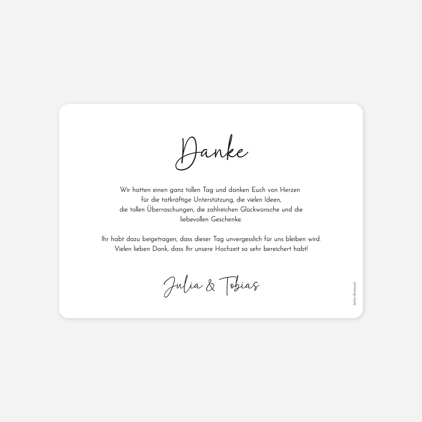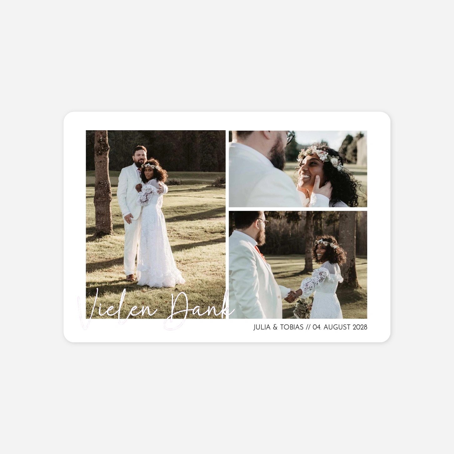 Mit der Danksagung Hochzeit "Timeless Together" lassen Sie die schönsten Momente Ihres großen Tages auf wundervolle Weise Revue passieren. Das Design setzt auf eine harmonische Collage, die es Ihnen ermöglicht, gleich mehrere Lieblingsfotos Ihrer Hochzeitsfeier stilvoll mit Ihren Gästen zu teilen. Dank unserer hauseigenen Produktion in Deutschland und Frankreich garantieren wir Ihnen eine erstklassige Druckqualität auf feinstem Premium-Papier. Um sicherzugehen, dass Ihre Dankeskarten zur Hochzeit perfekt werden, können Sie vorab gerne einen kostenlosen Probedruck bei uns bestellen.
