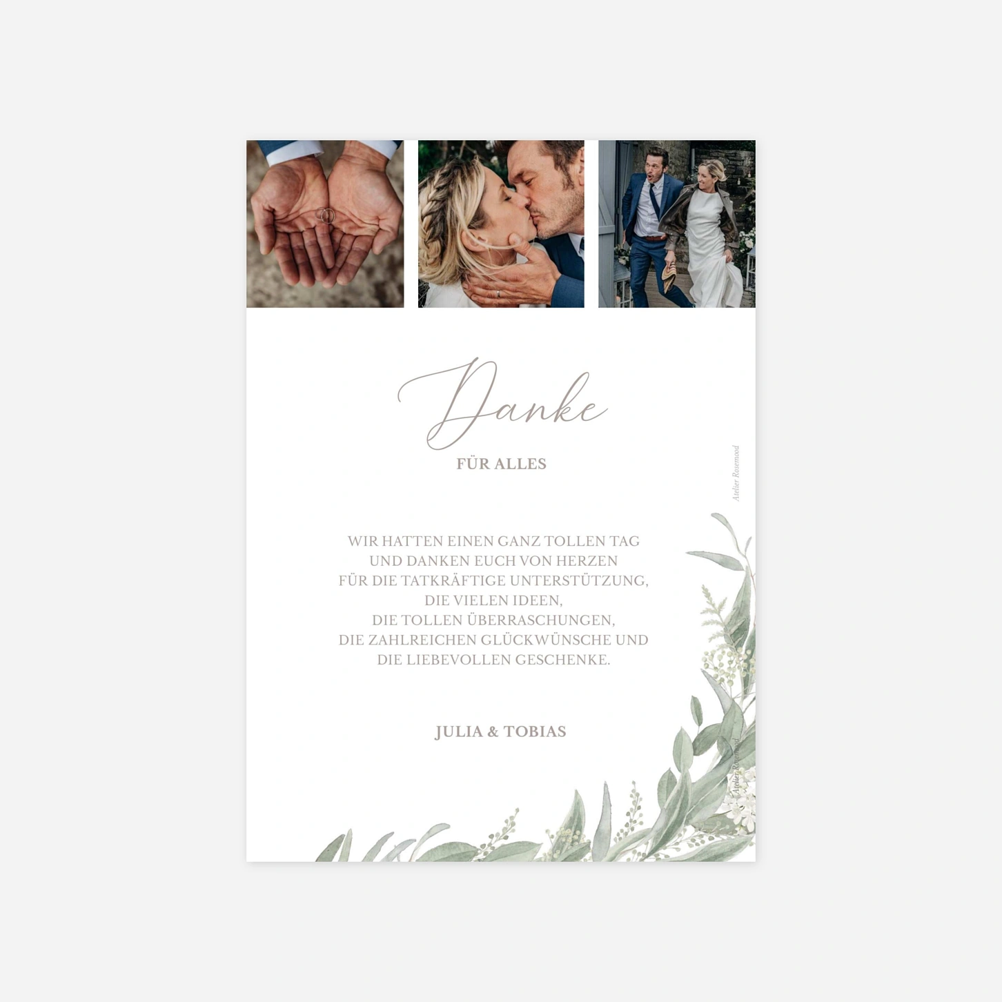 Die Danksagung Hochzeit "Unison" besticht durch ihre natürliche Eleganz und die zarten Aquarell-Illustrationen, die Ihr liebstes Hochzeitsfoto kunstvoll einrahmen. Dieses Design bietet eine wunderbare Möglichkeit, sich bei Ihren Gästen für die gemeinsamen Stunden zu bedanken und die emotionale Atmosphäre Ihres Festes noch einmal aufleben zu lassen. Damit Ihre Karten genau Ihren Vorstellungen entsprechen, bieten wir Ihnen gerne einen kostenlosen Probedruck an, bevor Sie Ihre gesamte Bestellung für die Einladung zur Hochzeit drucken lassen. Unsere hauseigenen Ateliers in Deutschland und Frankreich garantieren dabei eine präzise Verarbeitung und höchste Druckqualität für Ihre besonderen Erinnerungen. Gestalten Sie Ihre Dankeskarten zur Hochzeit jetzt ganz individuell online in unserem Editor.