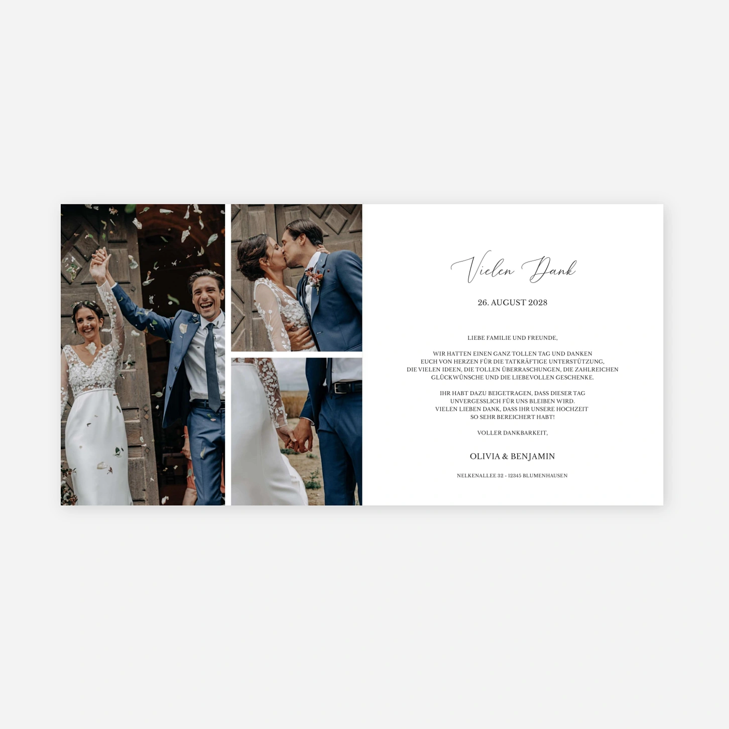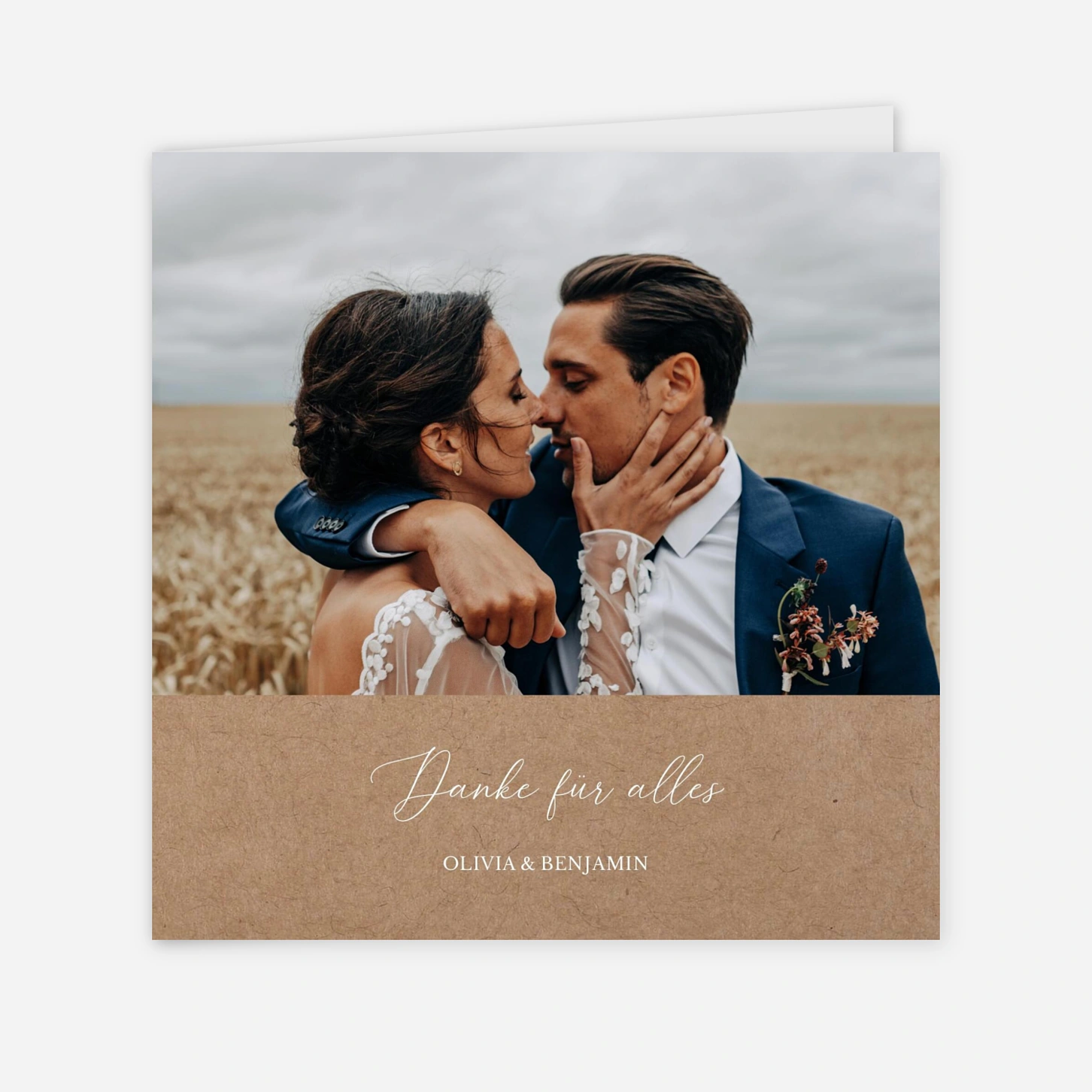 Verleihen Sie Ihrer Dankbarkeit einen natürlichen Ausdruck mit der Dankeskarte Hochzeit "Zarte Verbundenheit", die durch ihr rustikales Design und die elegante Schrift besticht. Dieses Modell bietet den idealen Rahmen für ein großflächiges Foto Ihres schönsten gemeinsamen Moments und lädt Ihre Gäste ein, den Zauber Ihres Festes noch einmal Revue passieren zu lassen. Da uns Ihre Zufriedenheit am Herzen liegt, werden alle Karten in unseren eigenen Produktionsstätten in Deutschland und Frankreich mit höchster Präzision gefertigt. Nutzen Sie unser Angebot eines kostenlosen Probedrucks, um sicherzustellen, dass Ihre Einladungen zur Hochzeit oder Dankeskarten genau Ihren Vorstellungen entsprechen.