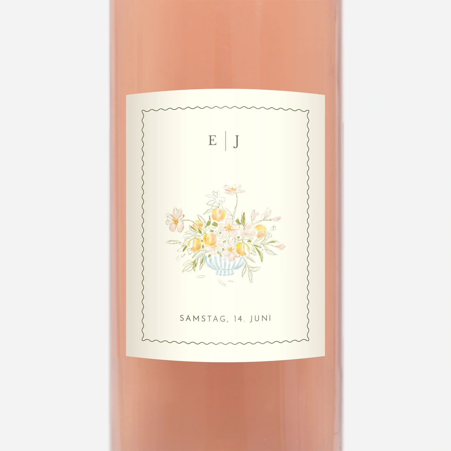 Das Flaschenetikett "Dolce Amore" fügt sich wunderbar in die Tischdekoration an Ihrem festlichen Tag ein. Ob für einen besonderen Wein oder eine erfrischende Limonade – dieses Etikett verleiht Ihren Flaschen durch das florale Bouquet, den modernen Rahmen in Wellenform sowie die Initialen und das Hochzeitsdatum eine sommerlich-elegante Ausstrahlung. Mit unserem Konfigurator können Sie den Text ganz einfach anpassen. Alle unsere Flaschenetiketten sind wasserresistent und damit perfekt für den Kontakt mit gekühlten Getränken geeignet.
