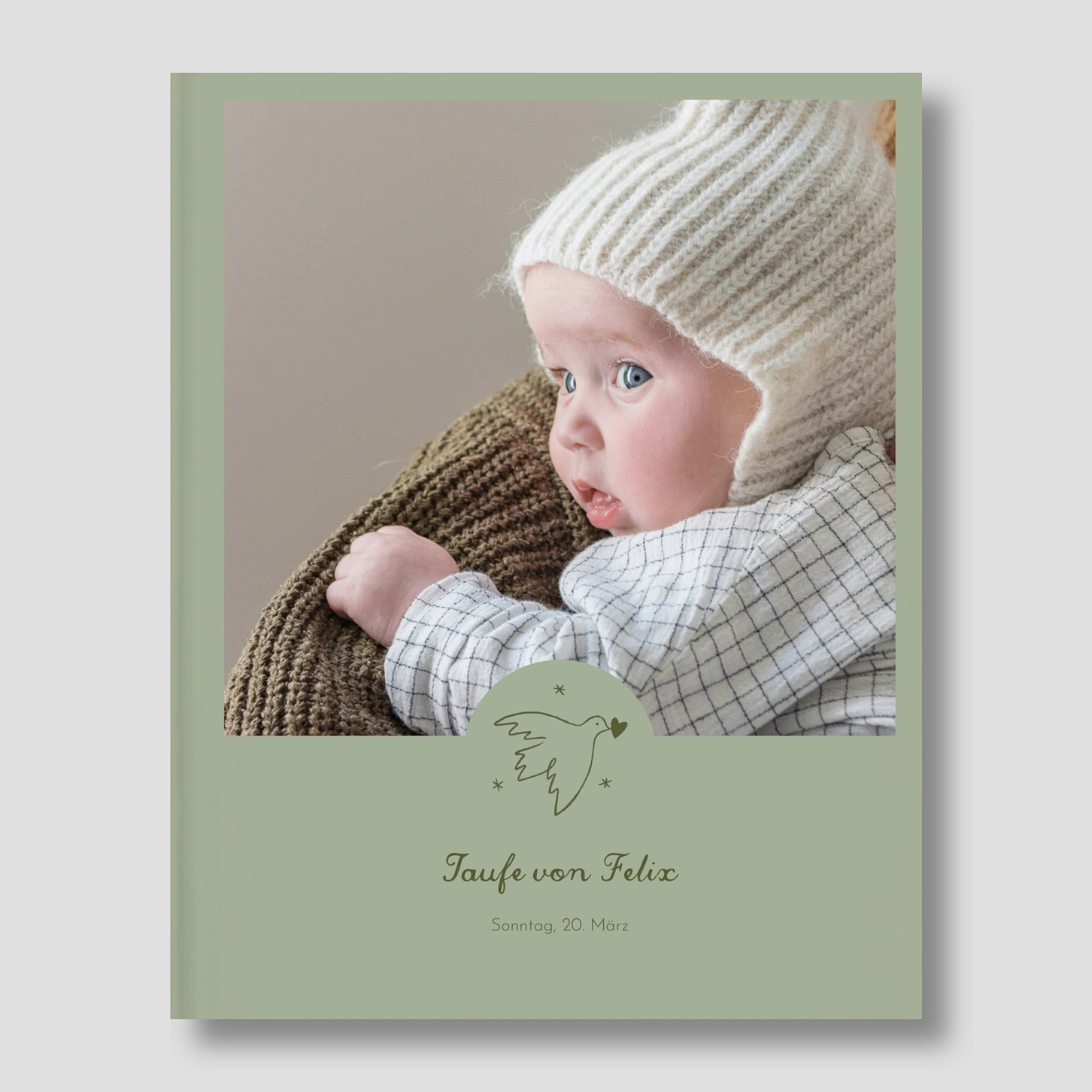 Das Fotobuch Hardcover „Zartes Vögelchen“ ist eine liebevolle Hommage an die schönsten Momente rund um die Taufe Ihres Kindes. Das sanfte Design mit der kleinen Friedenstaube verleiht Ihren Erinnerungen eine zarte, symbolische Note – perfekt, um emotionale Fotos und persönliche Texte stilvoll zu vereinen. Dank unserer hochwertigen Papiere und präzisen Drucktechnik entstehen langlebige Erinnerungsstücke, die Sie immer wieder gern zur Hand nehmen. Jedes Fotobuch wird in unserer eigenen Werkstatt gefertigt – mit viel Herz und handwerklicher Sorgfalt. Gestalten Sie Ihr persönliches Tauf-Fotobuch jetzt ganz einfach online.
