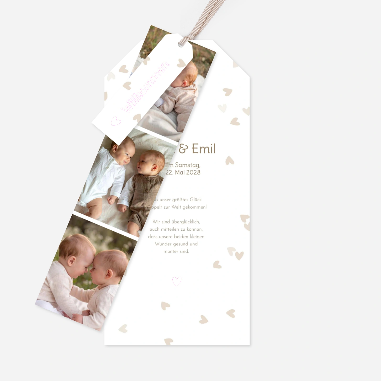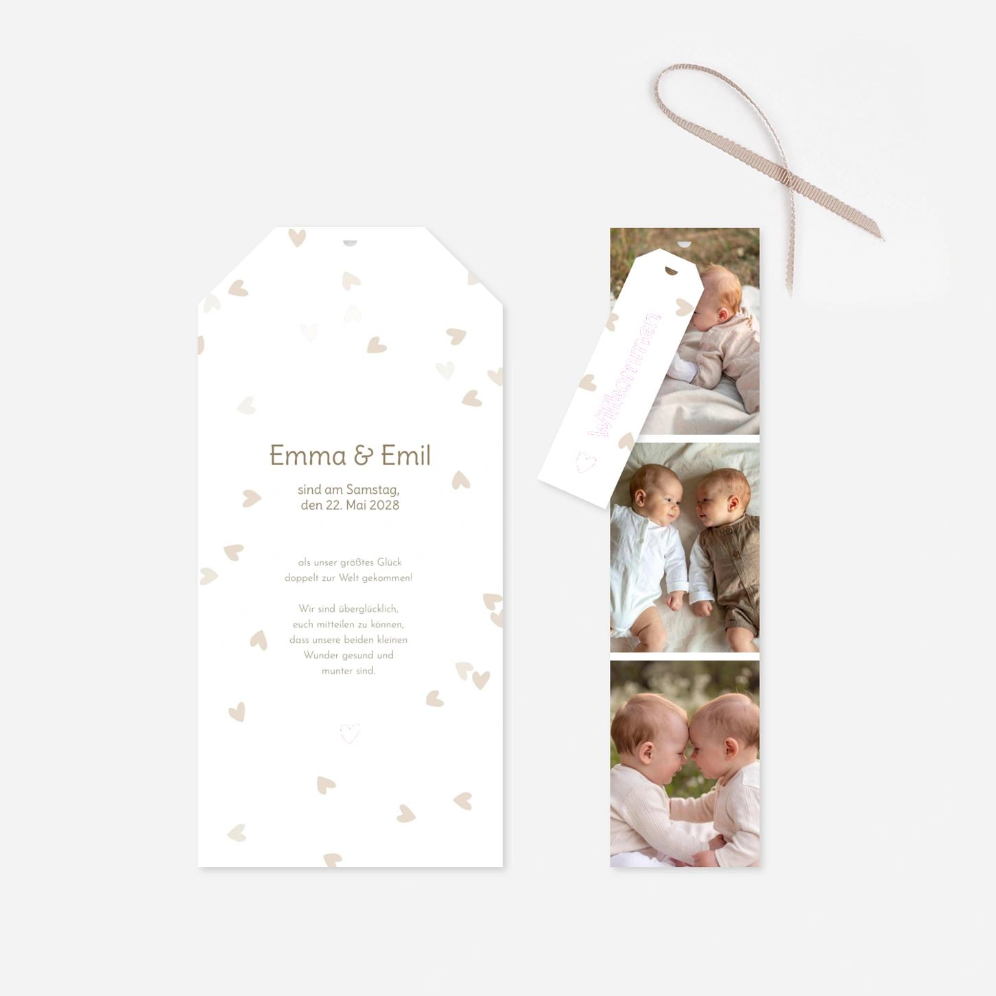 Die Geburtskarte "Doppeltes Glück" ist eine besonders liebevolle Art, die Ankunft Ihrer Zwillinge mit Familie und Freunden zu teilen. Das verspielte Design bietet Platz für mehrere Fotos und rückt Ihre beiden kleinen Wunder ins Zentrum der Aufmerksamkeit. Gestalten Sie Ihre Geburtskarte online ganz nach Ihren Wünschen und machen Sie daraus ein einzigartiges Erinnerungsstück. Unsere Karten werden in unseren eigenen Werkstätten in Frankreich und Deutschland auf hochwertigem Papier gedruckt. Nutzen Sie auch die Möglichkeit, ein kostenloses Muster vorab zu bestellen.