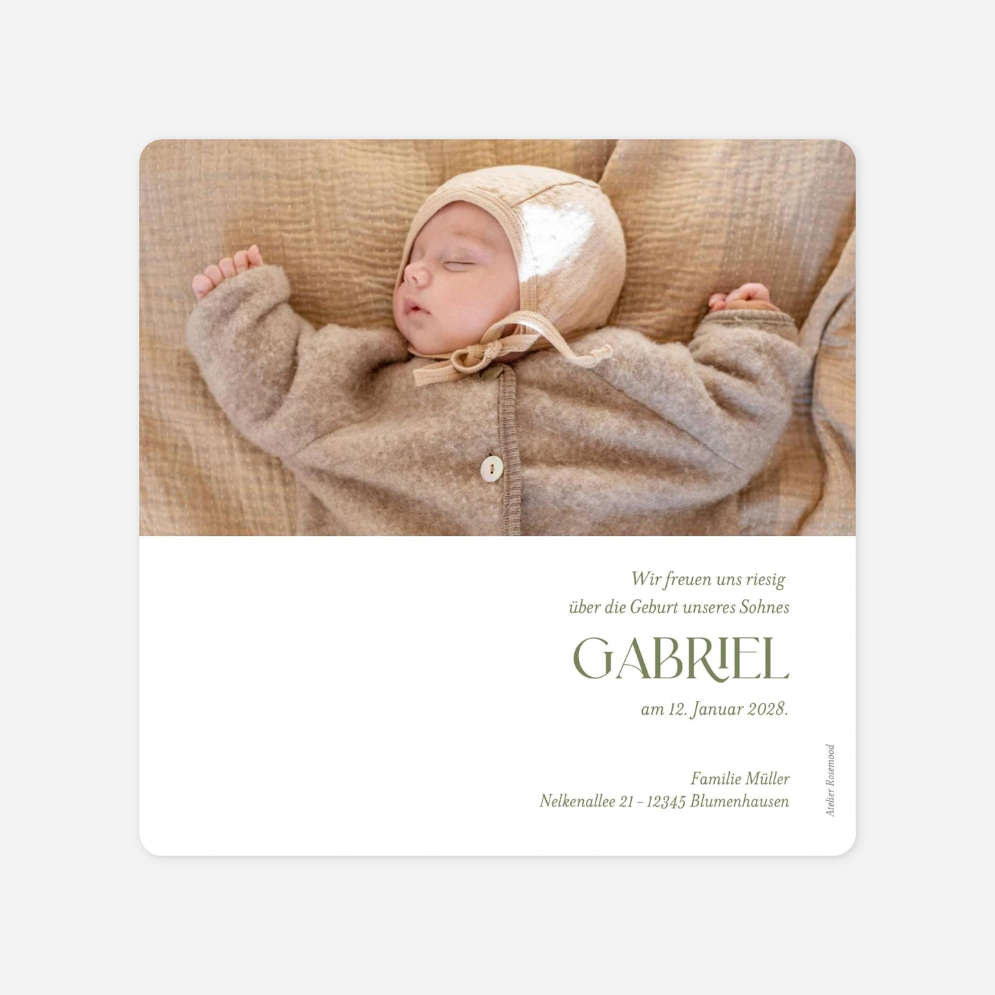 Unser hausinternes Designerteam Le Collectif hat für Sie die Geburtskarte Einzigartig entworfen. Was diese Geburtskarte besonders macht, sind gleich zwei große Fotofelder - einmal auf der Vorderseite und einmal auf der Rückseite der Karte - die viel Platz bieten, um die schönsten Fotos Ihres kleinen Schatzes einzufügen. Diese Geburtskarte mit 2 Fotofeldern ist mit klassischen oder abgerundeten Ecken erhältlich. Sie suchen nach Anregungen für ausgefallene Texte, die Sie auf der beidseitigen Karte einsetzen können? Schauen Sie gerne bei unseren Texten und Sprüchen für Geburtskarten vorbei. Über den Personalisieren-Button gelangen Sie zur Gestaltung der Karte. Informieren Sie sich gerne über alle Gestaltungsmöglichkeiten, um für Ihre Verwandten und Freunde die schönste Kreation zu entwerfen. Unser kompetenter Kundenservice hilft Ihnen bei allen Fragen und Unklarheiten gerne weiter.