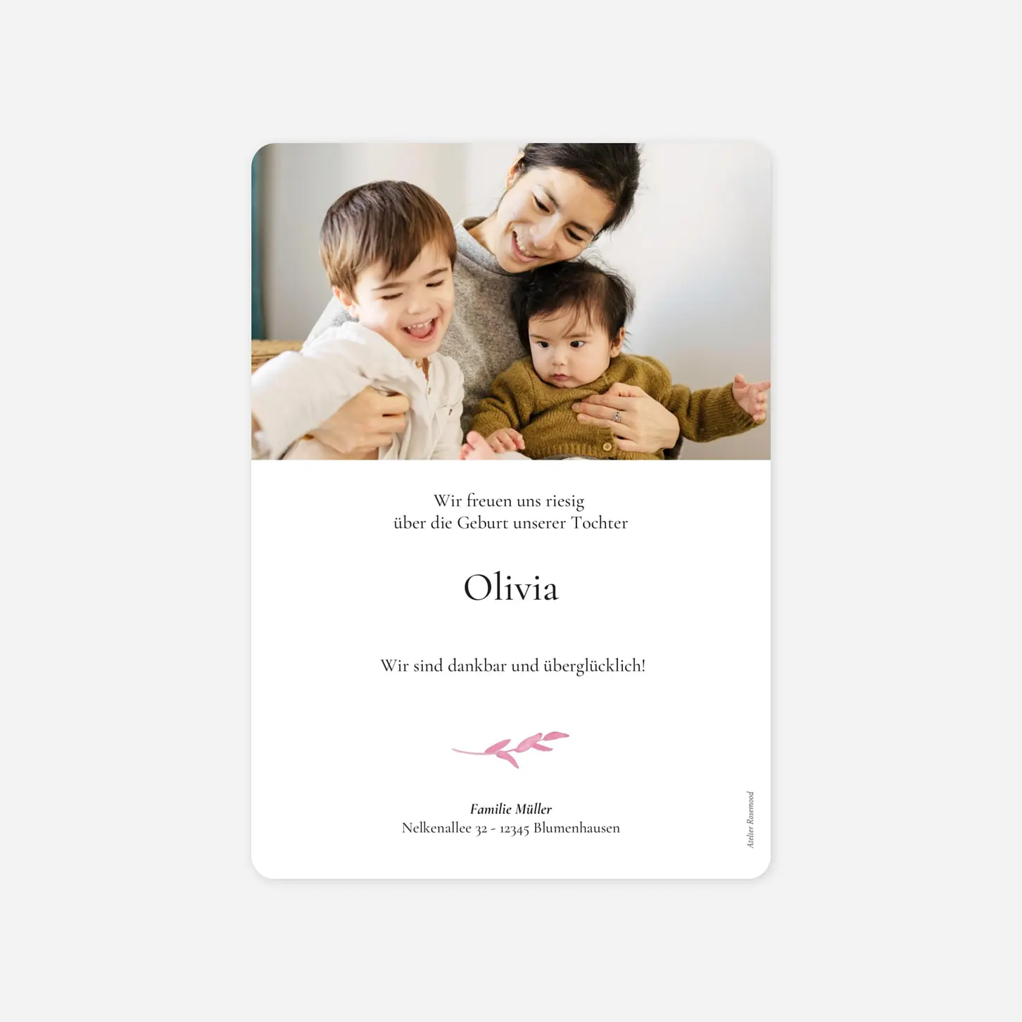 Über den frischen Zuwachs in Ihrer Familie möchten Sie mit voller Freude alle Ihre Liebsten informieren? Mit der Geburtskarte Eukalyptuskranz Fotostreifen lassen Sie Freunden und Familie eine wunderschöne Karte mit floralem Design zukommen, welches von unserem französischen Designer-Team Le Collectif entworfen wurde. Das Modell besteht aus zwei Komponenten: Der Hauptkarte sowie dem abnehmbaren Fotostreifen, der durch zwei Laschen festgehalten wird. Auf einer Seite befinden sich drei kleine Fotofelder übereinander, mit einem kleinen Textbereich unterhalb. Die andere Seite birgt vier Piktogramme, mit der jeweiligen Möglichkeit die Angaben darunter zu ergänzen. Auf der Hauptkarte befindet sich ein größeres Textfeld, das für Ihre ganz persönlichen Zeilen gedacht ist. Dessen Rückseite schmückt ein weiteres Fotofeld, für eine weitere geliebte Aufnahme. Die gesamte Geburtskarte wird verziert von Zweigen und Sträuchern. Entscheiden Sie selber, ob Sie diese Designelemente lieber in einem kühlen Grün wünschen, oder ein zartes Rosa bevorzugen. Die Hauptkarte besteht aus einem hippen Kraftpapier, der Fotostreifen hingegen ist im schlichten Weiß. Überzeugen Sie sich einfach selber von unserer Qualität und bestellen gleich einen kostenlosen Probedruck Ihrer liebsten Geburtskarte.