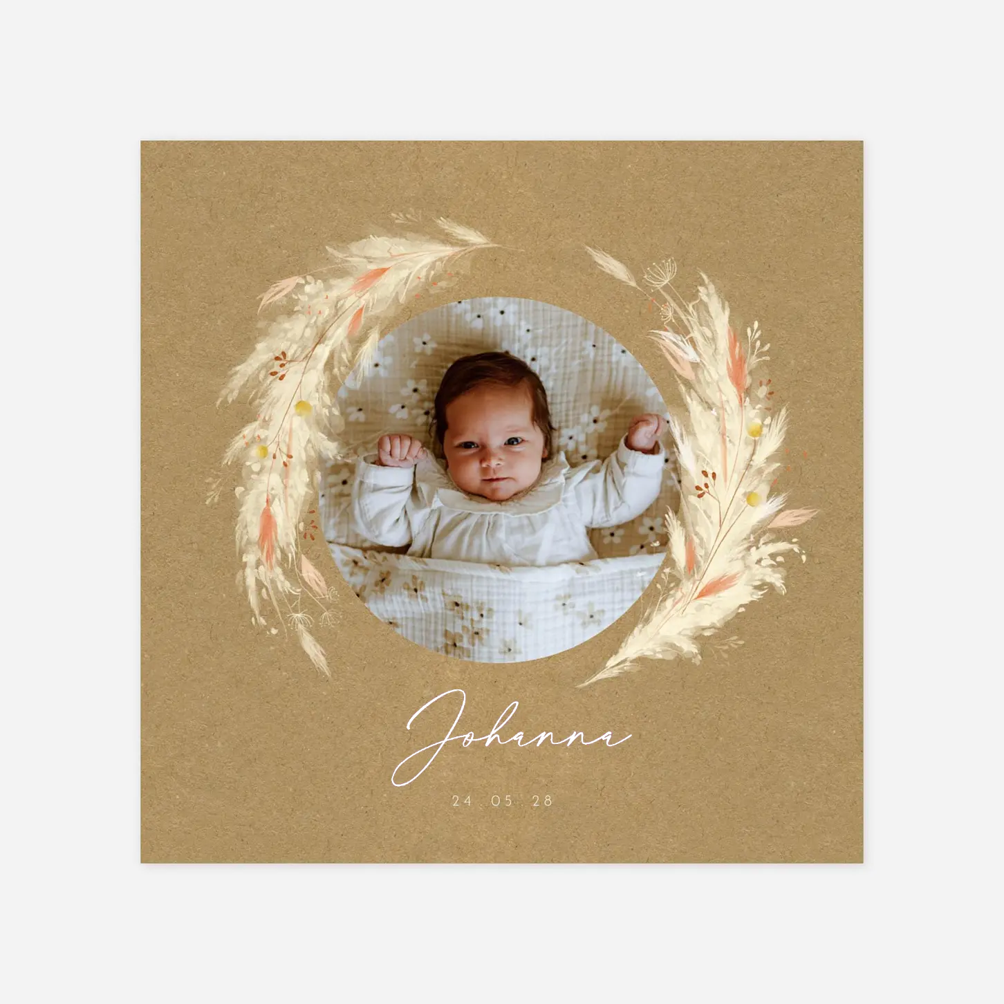 Weiches Federgras rahmt voller Leichtigkeit Ihr Lieblingsfoto Ihres Babys und hebt es hervor. Der Namen und einige liebevolle Worte machen diese Geburtskarte zu einem ganz persönlichen Stück Papeterie zur Geburt Ihres Kindes. Wir beraten Sie gern und stehen Ihnen telefonisch und schriftlich zur Verfügung.
