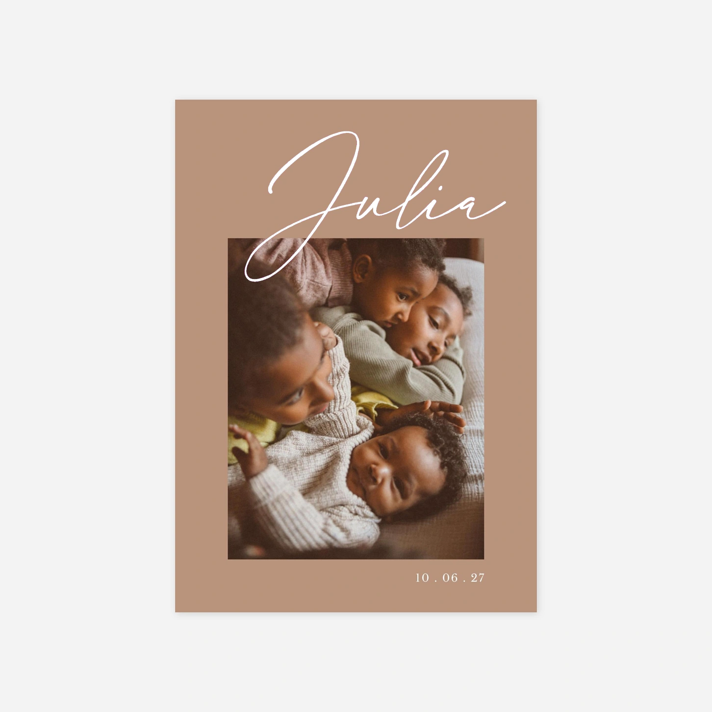 Teilen Sie Ihre Freude auf stilvolle und schlichte Weise mit der Geburtskarte "Freudiges Ereignis". Das liebevoll ausgewählte Foto Ihres Babys wird von einem harmonisch abgestimmten, farbigen Rahmen umgeben, während sein Name sanft und elegant eingefügt wird, um die besondere Bedeutung dieses Moments stilvoll zu unterstreichen. Diese Geburtskarte lässt sich online sowohl auf der Vorder- als auch auf der Rückseite mit Ihrem persönlichen Text und Foto gestalten.