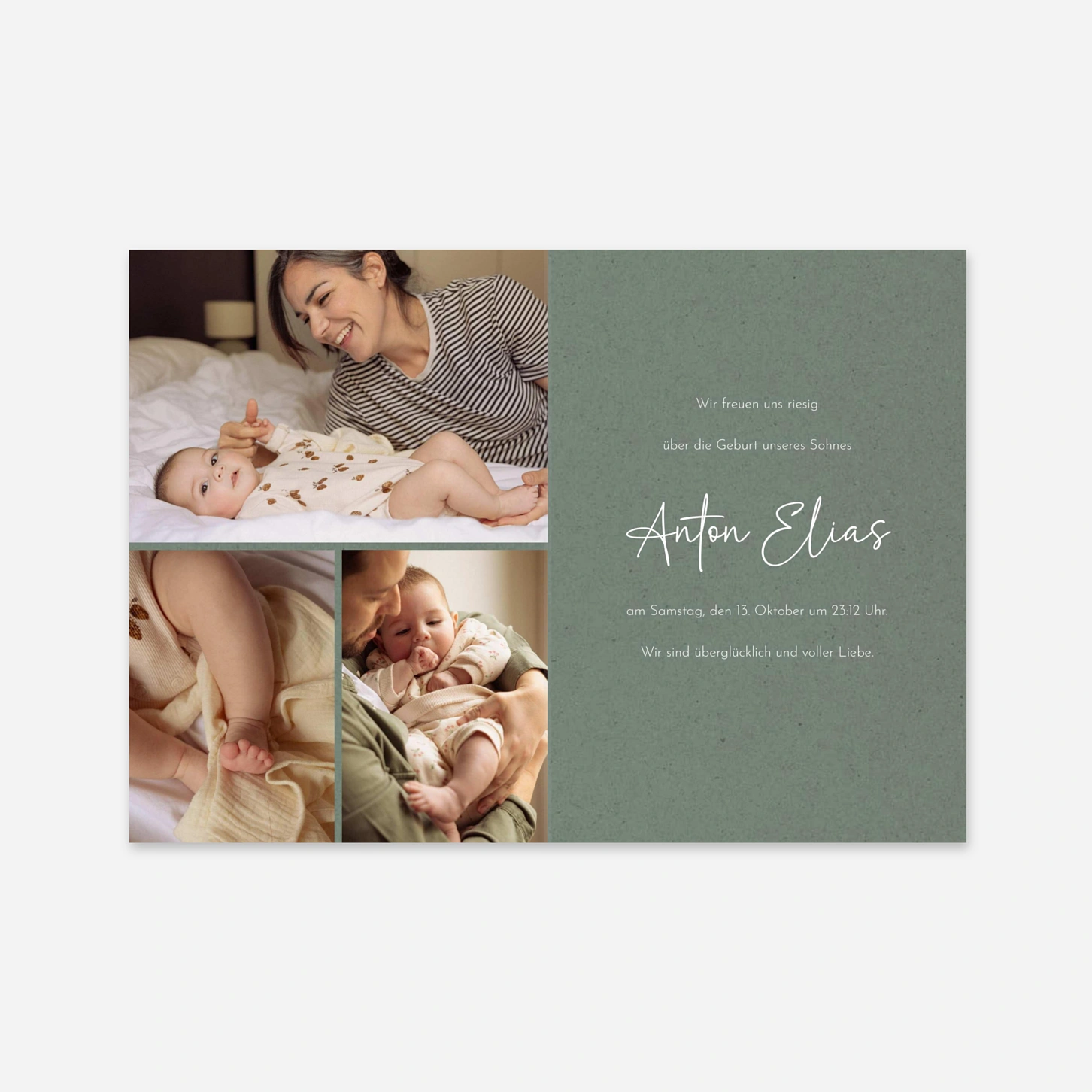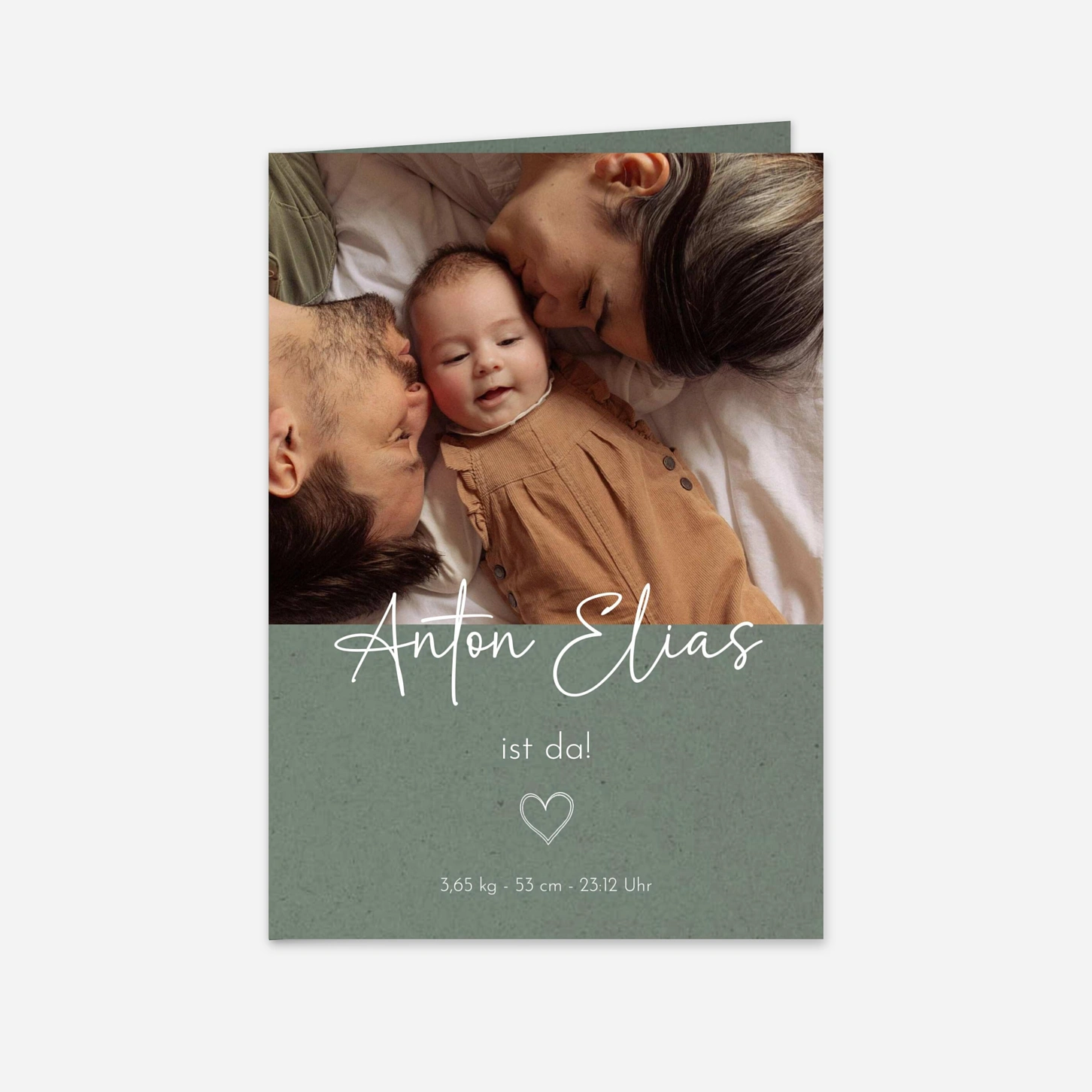 Die Geburtskarte Glückszeichen begrüßt Ihr kleines Wunder mit einer sanften Typografie und einem dezenten Herzsymbol – perfekt, um erste Familienfotos stilvoll in Szene zu setzen. Mit unserem Online-Editor können Sie Ihre Geburtskarte gestalten und so im Handumdrehen liebevoll personalisierte Babykarten verschicken. Wir drucken auf ausgewählten Premiumpapieren in unseren eigenen Ateliers in Deutschland und Frankreich, damit jedes Detail überzeugt. Auf Wunsch senden wir Ihnen vorab ein kostenloses Muster Ihrer Karte.