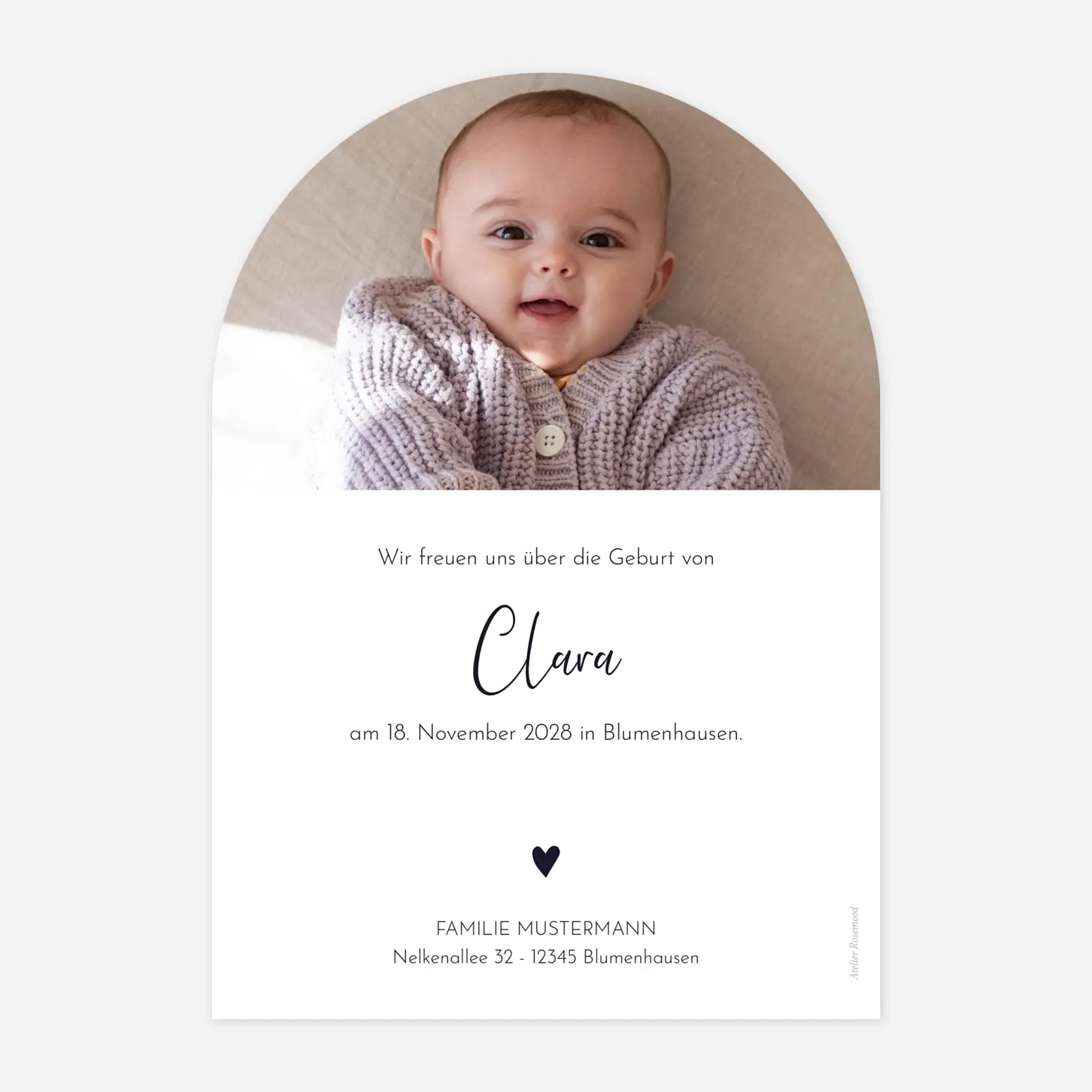 Teilen Sie Ihr Glück mit Ihrer Familie und Ihren Freunden mit unserer Geburtskarte Herz Medaillon. Drei Fotos Ihres Lieblings zieren die Vorderseite dieser besonderen Geburtskarte. In einem runden Medaillon zwischen den drei Bildern befindet sich ein goldenes Herz. Darüber notieren Sie den Namen und das Geburtsdatum Ihres Babys. Auf der Rückseite ist ein weiteres Fotofeld. Es gibt diese Karte in zwei Versionen, Rot und Grün. Die beiden Versionen unterscheiden sich in der Schriftfarbe und der Farbe des Herzens auf der Rückseite. Hinten haben Sie Platz für Ihren Text. Den Text fügen Sie direkt über unsere Webseite ein. So gestalten Sie Ihre individuelle Kreation.