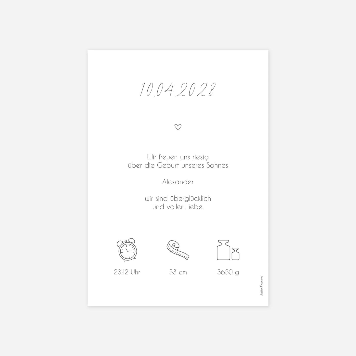 Die Geburtskarte „Herzgeschenk“ setzt Ihr Lieblingsfoto stilvoll in den Mittelpunkt und verleiht Ihrer Ankündigung einen modernen, klaren Charakter. Alle wichtigen Details zur Geburt Ihres Kindes haben einen schönen Platz, ergänzt durch liebevolle Symbole. Unsere Karten werden in eigenen Werkstätten in Deutschland und Frankreich mit höchster Sorgfalt gefertigt. Fordern Sie jetzt Ihr kostenloses Muster an und gestalten Sie Ihre persönliche Geburtskarte online.