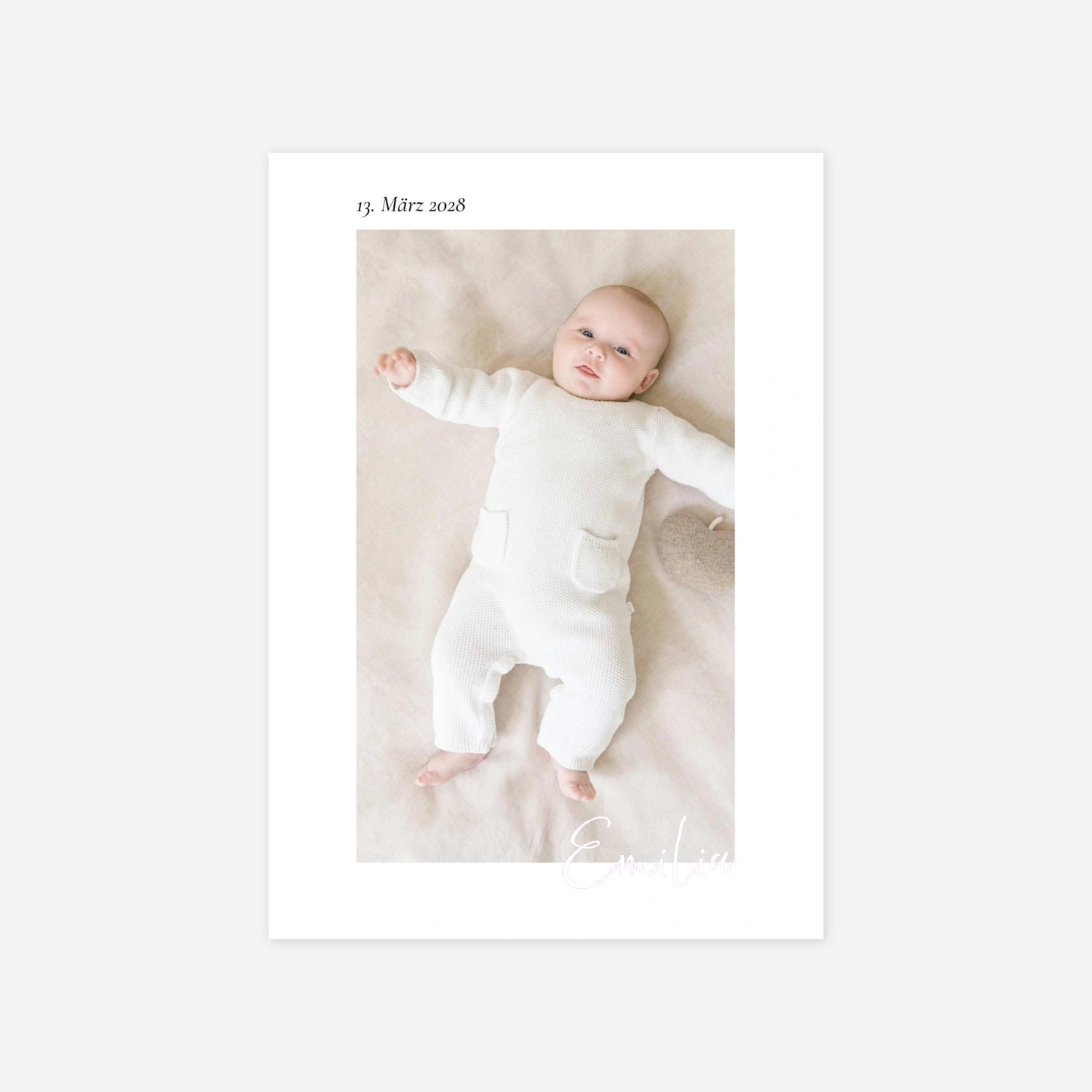 Wenn Sie sich für unsere Geburtskarte Kalligraphie Rahmen entscheiden, wählen Sie eine moderne Geburtskarte mit verspielten Zügen. Das Modell ziert auf der Vorderseite ein großes Fotofeld für Ihr schönstes Foto. Durch den Rand um das Foto herum, vermittelt es den Eindruck, als wäre Ihr Foto eingerahmt. Teils über dem Foto, teils über dem Rand, können Sie im unteren Bereich der Kartenvorderseite den Namen Ihres kleinen Schatzes einfügen, oder einen anderen beliebigen Text, der Ihnen gefällt. Am oberen Rand der Karte befindet sich ein weiteres Textfeld. Drehen Sie die Karte um, finden Sie ein zweites Fotofeld sowie reichlich Platz für Ihre persönlichen Worte, mit denen Sie all Ihren Liebsten die Geburt Ihrer Tochter oder Ihres Sohnes bekannt geben können. Entworfen wurde die romantische Geburtskarte von unserem einfallsreichen Designer-Team Le Collectif. Vielleicht interessieren Sie neben unseren Geburtskarten unsere Baby-Fotobücher, in welchen Sie die ersten Momente für immer festhalten und dokumentieren können.