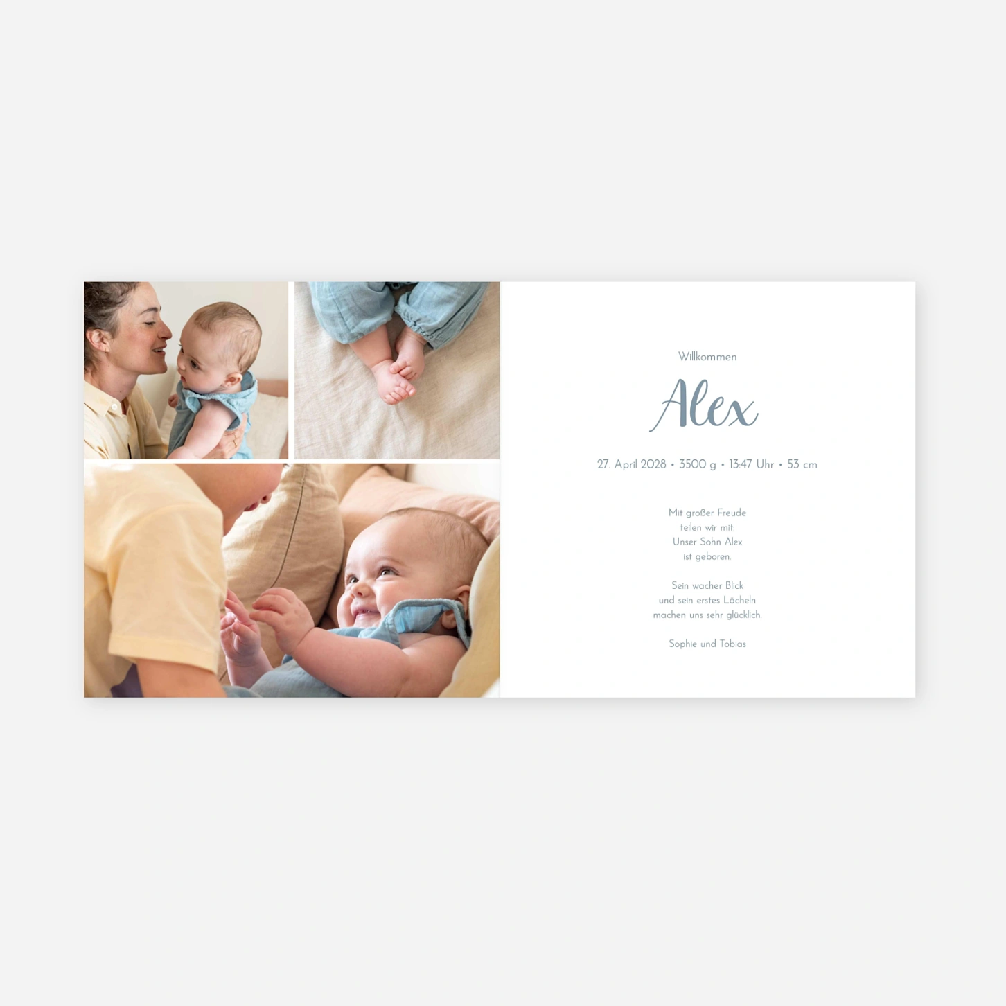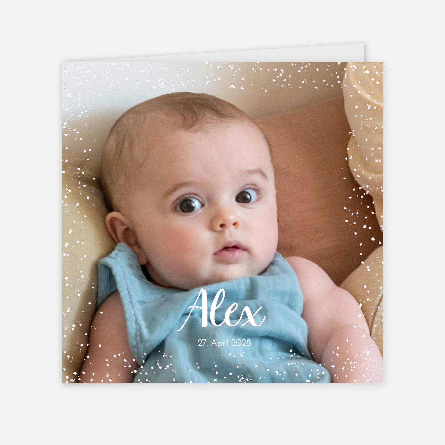 Die Geburtskarte „Kleiner Sternenregen“ verleiht der Ankündigung Ihres Babys eine zarte, moderne Leichtigkeit und rückt das Foto Ihres Kindes liebevoll in den Mittelpunkt. Das feine Sternenmotiv umrahmt Ihre persönlichen Angaben und macht diese Geburtskarte zu einer warmen, zeitlosen Erinnerung für Familie und Freunde. Wenn Sie Ihre Geburtskarte gestalten, profitieren Sie von unseren hochwertigen Druckverfahren sowie der Gestaltung durch unser hauseigenes Designteam. Gut zu wissen: Für Geburtskarten bieten wir Ihnen kostenlose Muster an – gestalten Sie Ihr Lieblingsdesign jetzt ganz entspannt online.