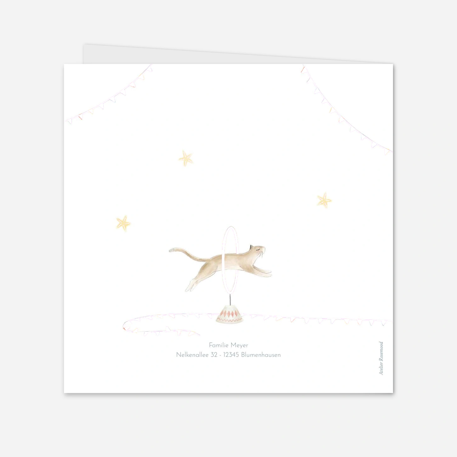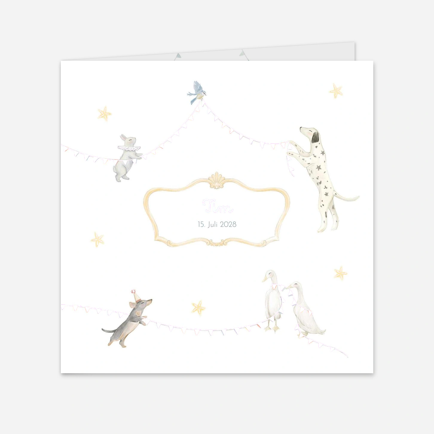 Die Geburtskarte "Kleiner Zirkus" entführt Ihre Liebsten in eine fröhliche, fantasievolle Welt, in der bezaubernde kleine Tiere ihre Vorstellung geben. Hunde, Mäuse und Vögel spielen zwischen Girlanden und Sternen wie in einem sanften, imaginären Umzug. Diese zarte und poetische Illustration begleitet auf wunderbare Weise die Ankündigung der Geburt Ihres Babys. In unseren Ateliers in Frankreich und Deutschland gestaltet, vereint sie Kreativität und handwerkliche Qualität. Zur Sicherheit können Sie vorab ein kostenloses Muster bestellen, bevor Sie Ihr Modell personalisieren.
