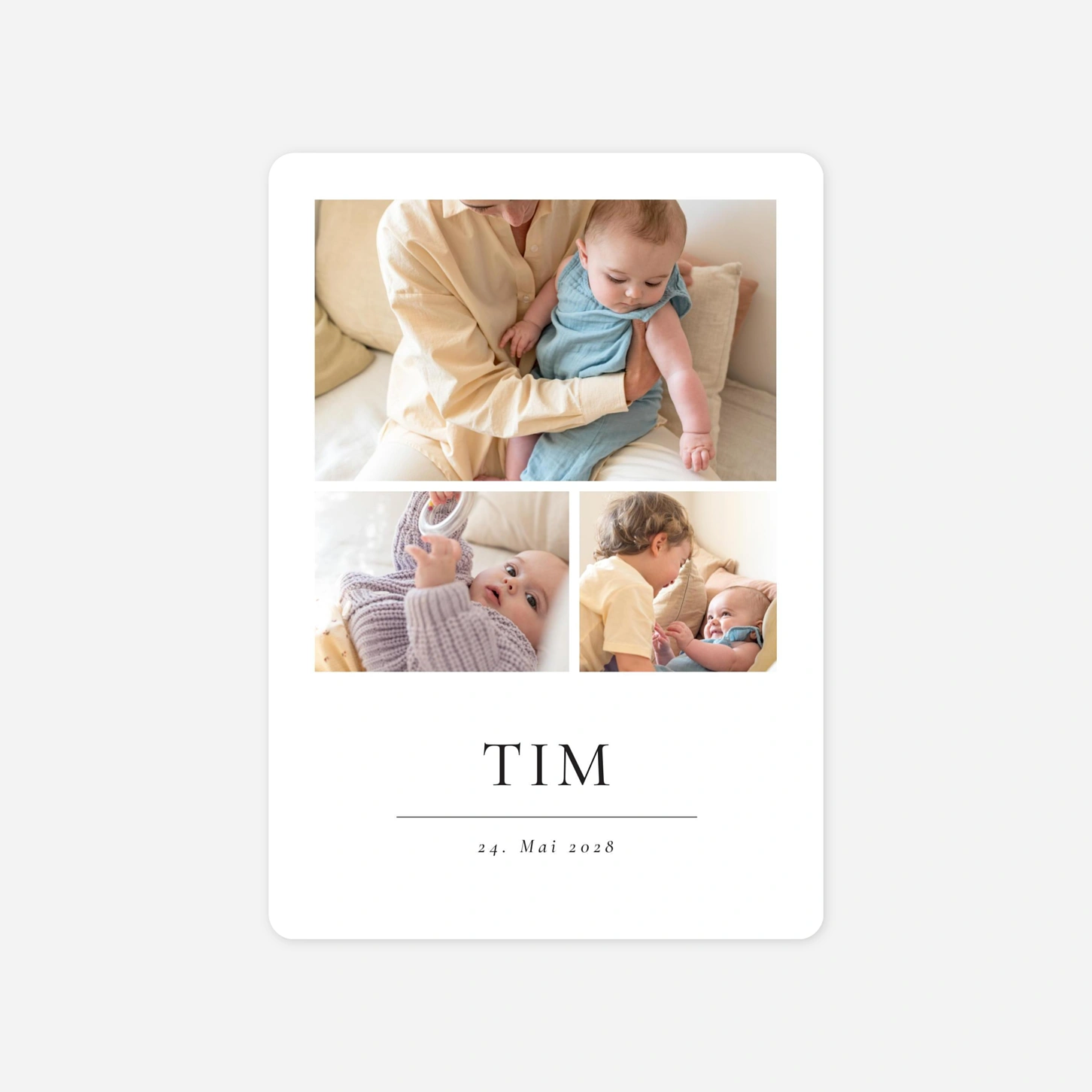 Mit schlichter Eleganz kündigt die Geburtskarte Kostbare Momente (4 Fotos) die Geburt Ihres Kindes an! Entworfen wurde die klassische Geburtskarte von unserem internen Designteam Le Collectif. Unsere Designer sind stets auf der Suche nach den neusten, wie auch zeitlosen Trends, um Ihre frohe Botschaft mit Stil und Geschmack zu verkünden. In unserem einfach zu bedienenden Online-Editor können Sie die Geburtskarte Kostbare Momente (4 Fotos) ganz nach Ihren Wünschen personalisieren. Die Vorderseite der zweiseitigen Geburtskarte hält Platz für 3 Ihrer schönsten Fotos bereit. Darunter befinden sich zwei durch eine schwarze Linie getrennte Textfelder, die mit dem Namen und dem Geburtsdatum Ihres Kindes gefüllt werden können. Die Rückseite bietet Platz für ein weiteres Bild und Ihren persönlichen Text. Falls Sie sich noch unsicher sind, welche Papiersorte Sie wählen sollen oder welches Design es werden soll, bieten wir Ihnen die Möglichkeit, einen personalisierten kostenlosen Probedruck zu bestellen. Unser freundlicher Kundenservice steht Ihnen sehr gerne bei der Gestaltung Ihrer Karten oder dem Bestellvorgang zur Verfügung.