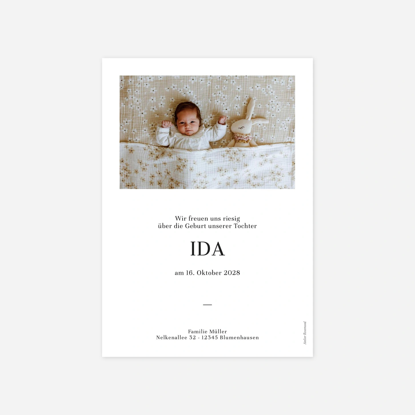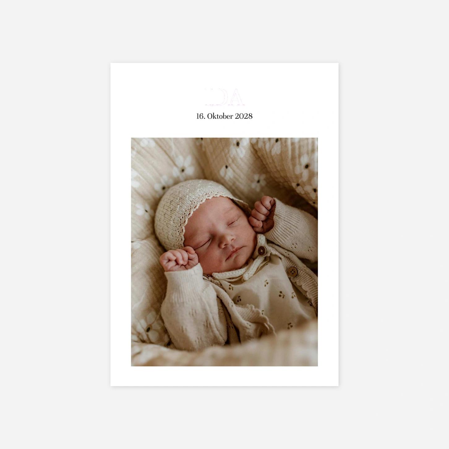 Sie möchten Ihre Lieben über die Geburt Ihres Kindes informieren und suchen eine besonders stilvolle und fröhliche Möglichkeit? Dann nutzen Sie doch unsere zauberhafte Geburtskarte „Magazin”. Das Modell wurde von unseren hauseigenen Designern Le Collectif entworfen und ist in den beiden Farbvarianten Weiß und Sepia erhältlich. Die äußere Klappkarte präsentiert großflächig die gewählte Farbe, auf der Rückseite können Sie ein Foto Ihres kleinen Lieblings einfügen. Innen bleibt Platz für ein weiteres Bild sowie eine persönliche Nachricht an Ihre Lieben. Natürlich können Sie alle Elemente der Geburtskarte in unserem Online-Editor personalisieren und ganz nach Ihren Vorstellungen anpassen. So passt die fertige Geburtskarte am Ende wunderbar zu Ihnen und wird Ihren Lieben ein Strahlen auf das Gesicht zaubern! Falls Sie noch etwas Inspiration für den Text benötigen, helfen Ihnen vielleicht unsere Textideen Geburtskarte weiter. Dort haben wir eine Reihe an Vorschlägen und weiteren Elementen wie passenden Sprüchen und Zitaten zusammengestellt. Bestimmt ist etwas Passendes für Sie dabei!