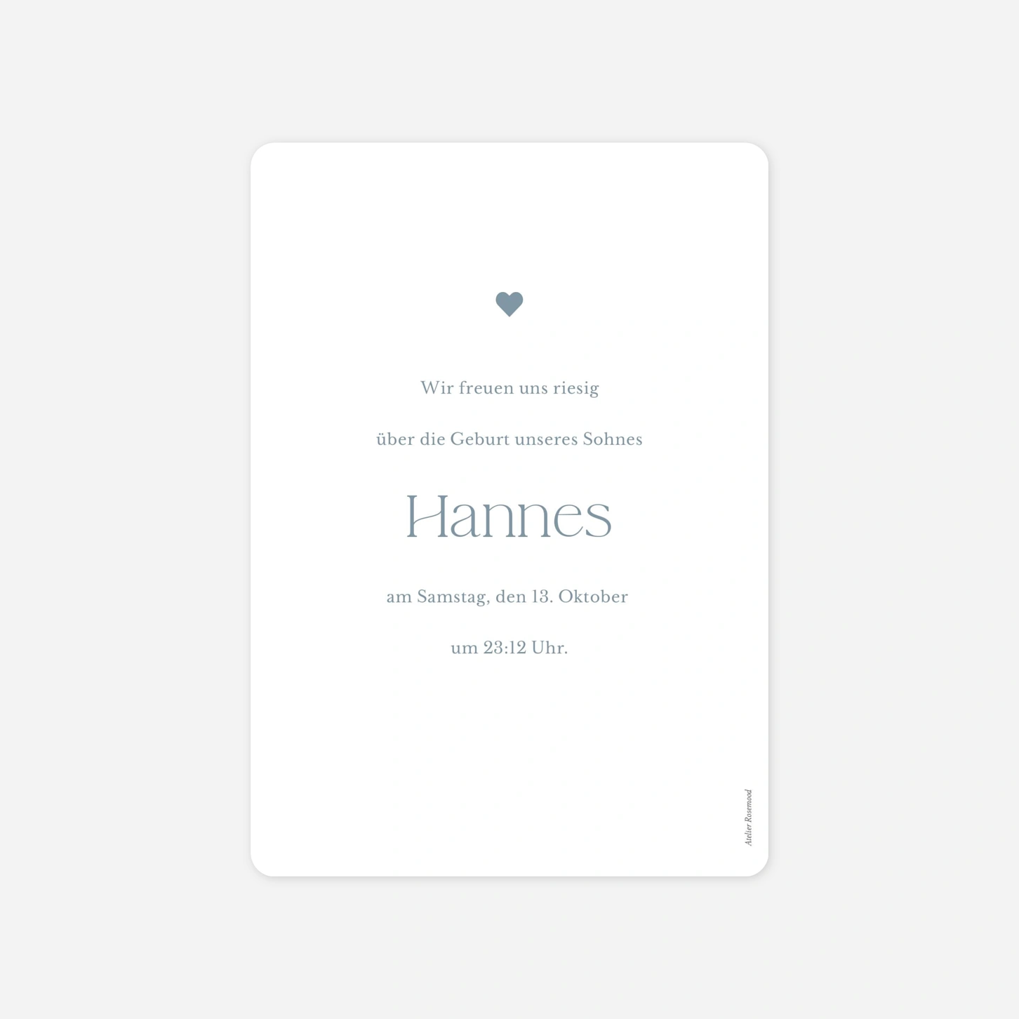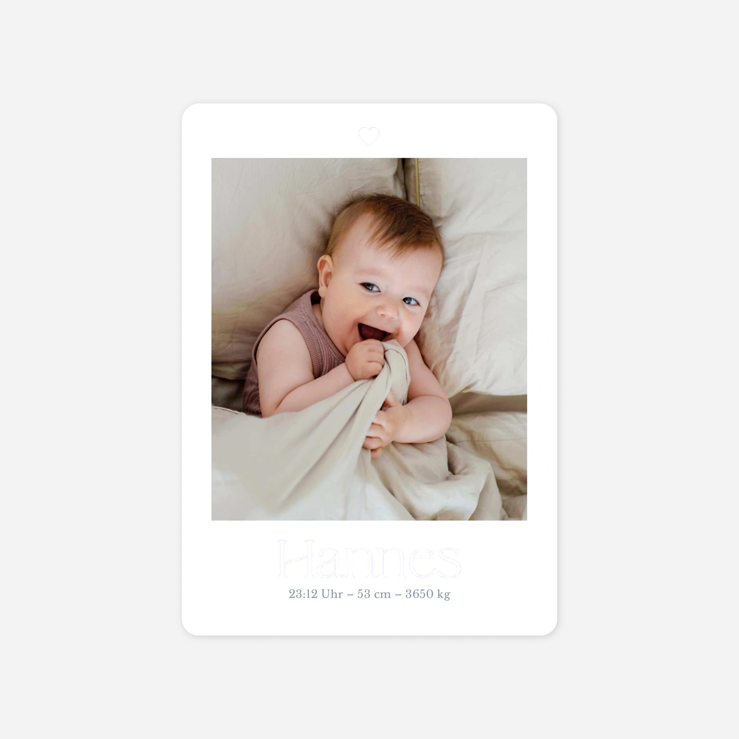 Die Geburtskarte "Mein Herzensglück" setzt Ihr Babyfoto liebevoll in den Mittelpunkt und unterstreicht die schönsten ersten Daten mit einem modernen, schlichten Layout. Das kleine Herzsymbol verleiht der Karte eine warme, persönliche Note, die Familie und Freunde berührt. Dank unserer hauseigenen Fertigung in Deutschland und Frankreich wird jedes Detail präzise umgesetzt. Fordern Sie gerne ein kostenloses Muster an, bevor Sie Ihre Geburtskarte gestalten.