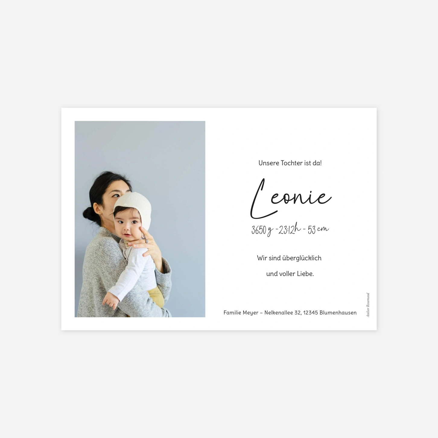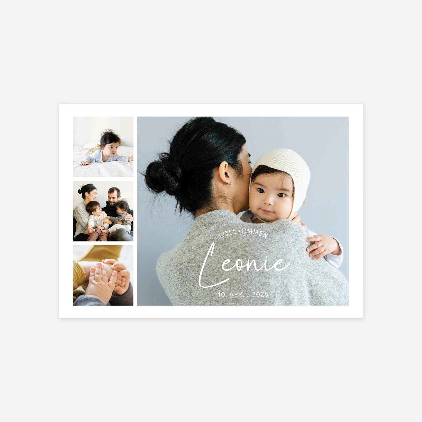 Die Geburtskarte "Morgensternchen" rückt Ihr kleines Wunder mit liebevollen Fotos und einem modernen Layout in den Mittelpunkt. Dank der klaren Gestaltung bleibt Raum für die schönsten Details und Ihre persönlichen Worte. Unsere Karten werden in eigenen Werkstätten in Deutschland und Frankreich auf hochwertigem Papier gedruckt. Auf Wunsch können Sie vorab ein kostenloses Muster bestellen und so Ihre Geburtskarte ganz entspannt gestalten.