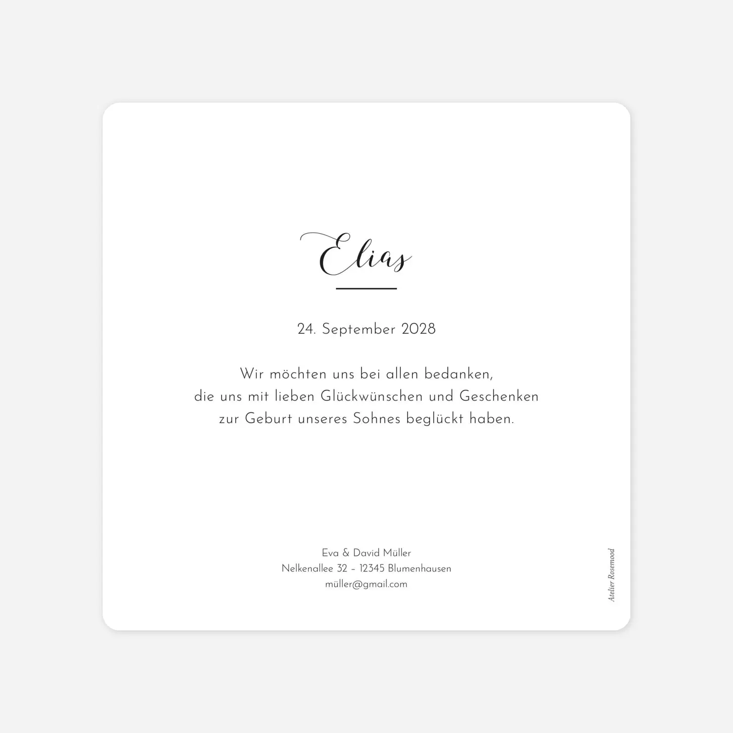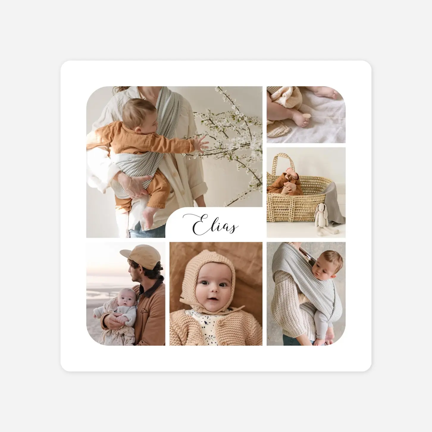Die Geburtskarten Raffinesse Fotos ist das ideale Modell, wenn Sie Schlichtheit gerne mögen, aber dennoch nicht darauf verzichten möchten, Ihrer Familie und Ihren FreundInnen viele Fotos Ihres neugeborenen Kindes zu zeigen. In die Mitte dieser wunderschönen, modernen Geburtskarte können Sie den Anfangsbuchstaben des Namens Ihres Kindes schreiben - darunter findet sich noch genügend Platz für das Geburtsdatum. Rund um diesen kleinen, mittigen Akzent können Sie verschiedene schöne Fotos ordnen - suchen Sie sich hierfür die allerschönsten Bilder Ihres Kindes aus! Die Rückseite dient dazu, etwas mehr Text zu schreiben: hier können Sie entweder Dankesworte an die Leute, die Ihnen schon gratuliert haben richten oder mehr generelle Informationen zur Geburt Ihres Kindes. Eventuell haben Sie ja sogar ein Lieblingszitat, das Sie hier einfügen möchten? Auf jeden Fall können Sie sich sowohl die Schriftart als auch -farbe aussuchen und diese Seite so gestalten, wie es Ihnen am besten gefällt. Über den “Personalisieren” - Button auf der rechten Seite kommen Sie ganz einfach in unseren Editor und schon können Sie mit der Personalisierung loslegen.