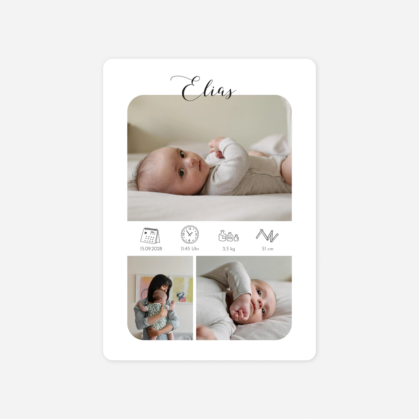 Die Geburtskarte Raffinesse Piktogramme erweitert unsere beliebte Geburtskarten-Kollektion Raffinesse mit einem weiteren Klassiker: Für diese Variante hat unser hauseigenes Designteam Le Collectif das schlichte Kartendesign auf der Vorderseite mit Piktogrammen ergänzt, die die Angaben zur Geburt Ihres Babys auf eine wunderbare Weise visualisieren. Mit einem Klick in die Textfelder können Sie Datum, Uhrzeit, Größe und Gewicht personalisieren. Zudem lassen sich auf dieser Geburtskarte insgesamt vier Fotos Ihres Babys präsentieren. Unser intuitiver Online-Editor macht es spielend einfach, die Bilder per Drag-and-Drop einzufügen. Die Rückseite der Geburtskarte ist minimalistisch gehalten und bietet genügend Platz, um Ihre Freude über die Ankunft Ihres Babys mit Ihren Liebsten zu teilen. Denken Sie daran, auch Ihre Kontaktdaten zu personalisieren, um Ihre Bestellung abzuschließen. Unser umfangreicher Katalog bietet nicht nur weitere Geburtskarten mit Fotos, sondern auch eine große Auswahl an personalisierbaren Aufklebern – dekorieren und verzieren Sie Ihre Umschläge auf einen Streich. Schon gewusst? Als Neukunde können Sie von einem kostenlosen personalisierten Probedruck profitieren. Wir stehen Ihnen bei der Gestaltung Ihrer Geburtskarte gerne beratend zur Seite und freuen uns auf Ihre Kontaktaufnahme per Telefon, E-Mail oder Chat.
