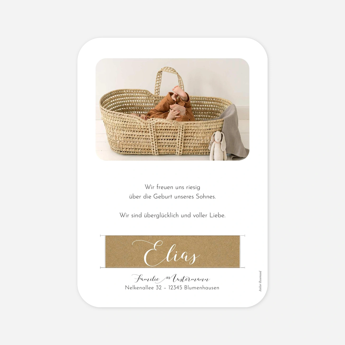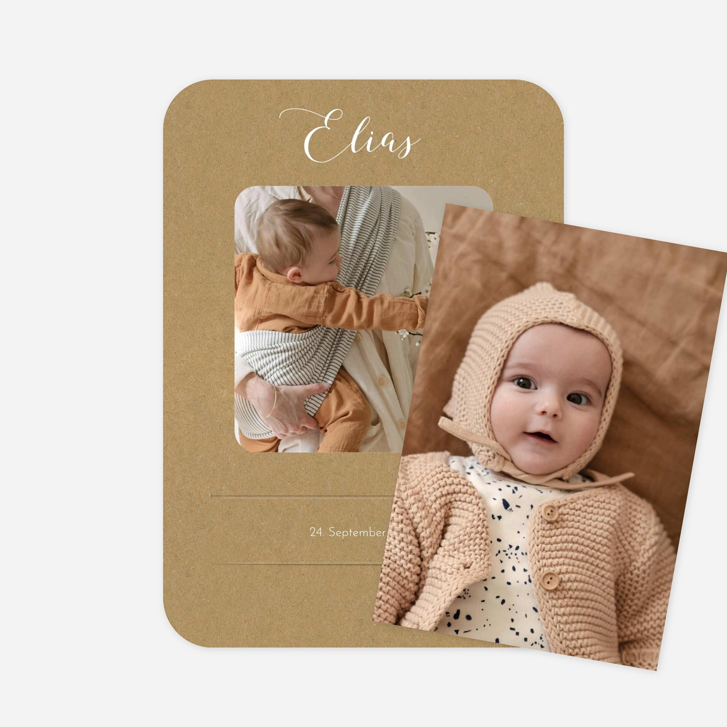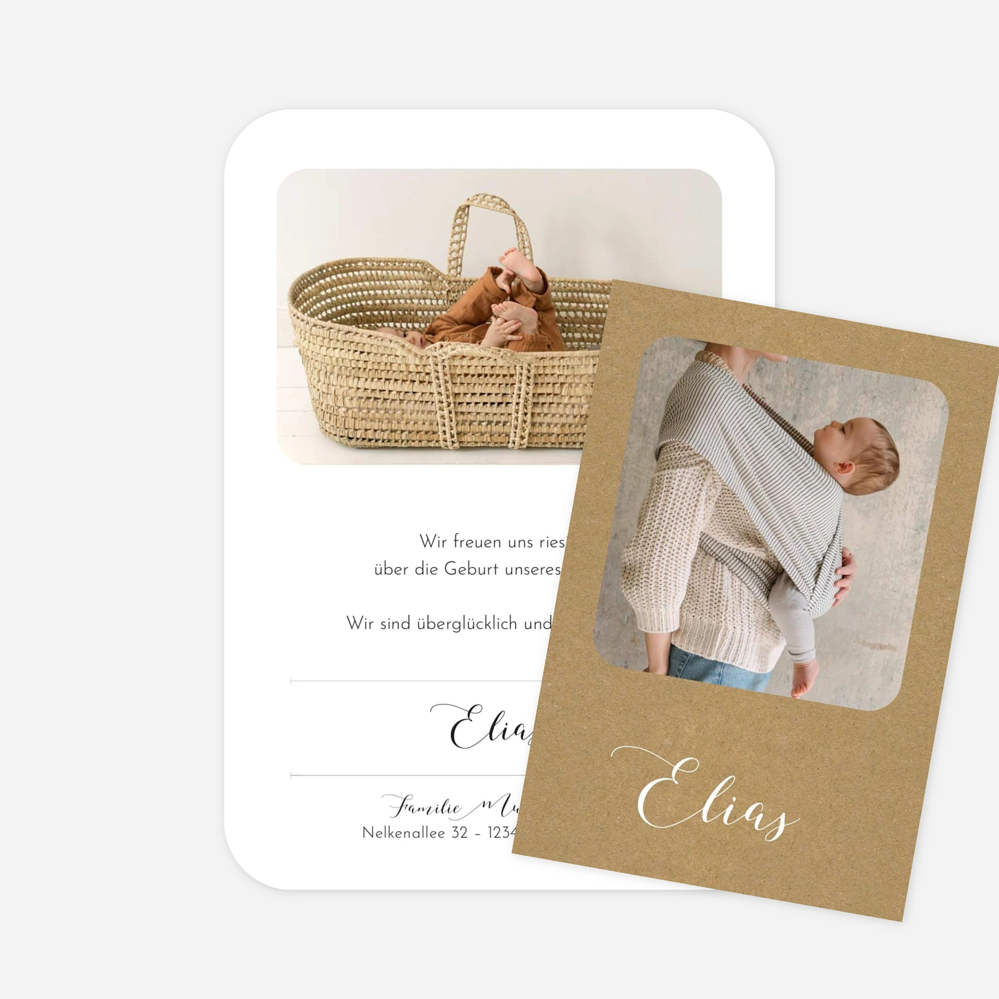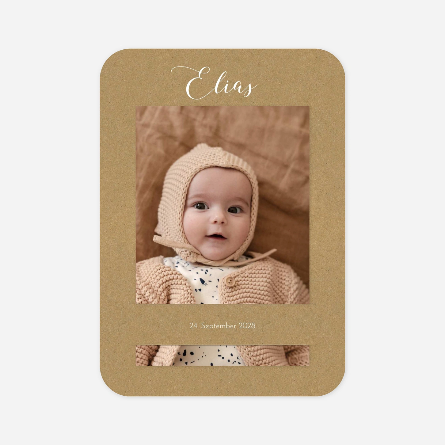 Wenn Sie ein Fan von Schlichtheit sind, dann liegen Sie mit unserer Geburtskarte Raffinesse genau richtig. Dieses Modell besticht durch schlichte Eleganz und setzt ein Foto Ihres Kindes (oder gar eines von Ihnen beiden) absolut perfekt in Szene. Die Schrift ragt fein und kaum merklich über den Bildrand hinein in das Foto und gibt dieser modernen Geburtskarte das gewisse Etwas. Auf der Rückseite dieser modernen Geburtskarte können Sie dann etwas mehr Text einfügen - zum Beispiel ein kleines, nettes Zitat, das Sie gerne mögen oder einfach mehr Informationen zur Geburt Ihres Kindes. Die EmpfängerInnen dieser Karte werden sich in jedem Fall sehr über den Erhalt dieses wunderschönen Modells freuen!