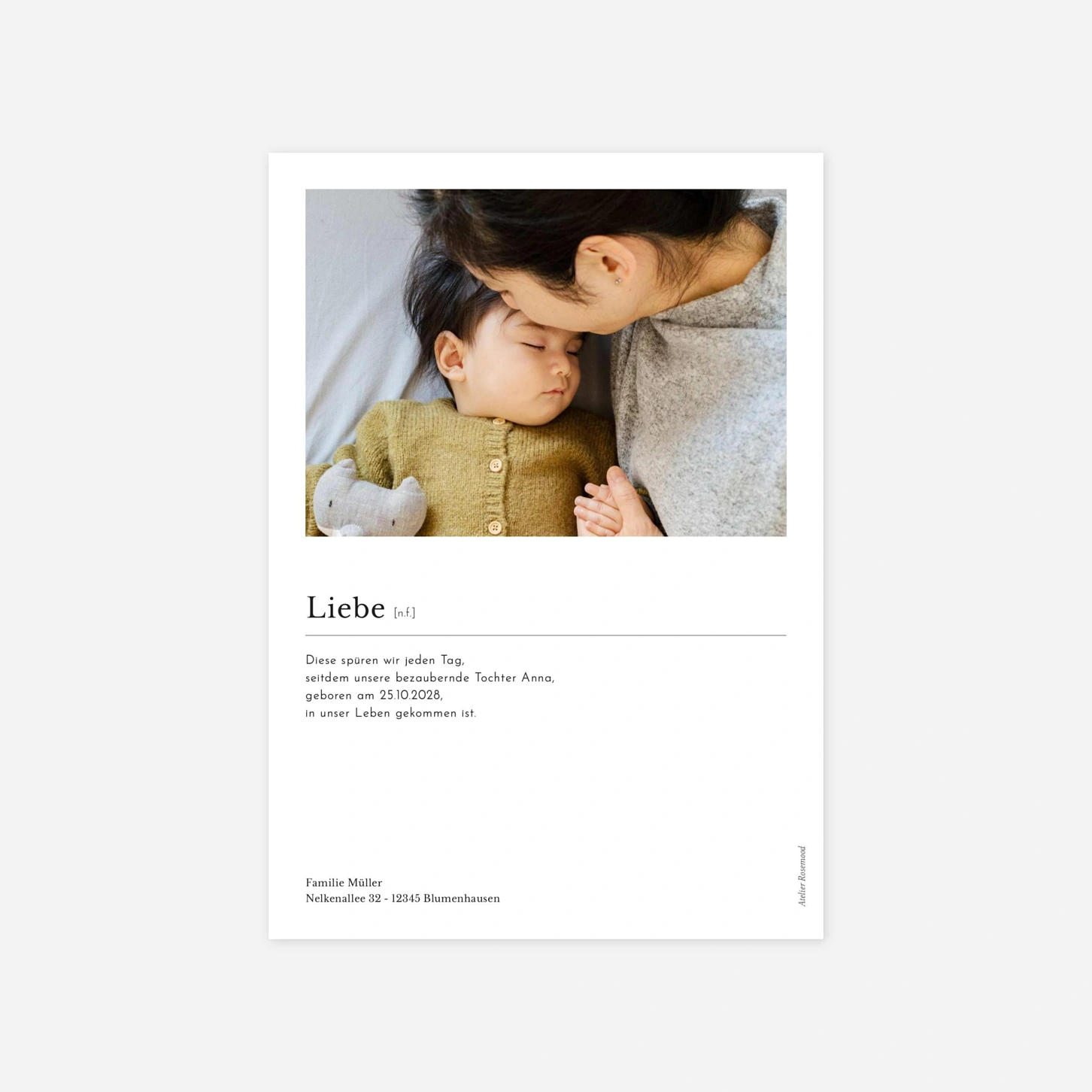 Unsere Geburtskarte Schreibmaschine überzeugt durch ein schlichtes Design und klare Linien mit viel Platz für Ihren Text und Ihre Fotos. Verkünden Sie das freudige Ereignis, die Geburt Ihres Kindes, mit dieser einzigartigen Geburtskarte. Auf der Vorderseite können Sie in unserem Online-Editor ein Foto Ihres kleinen Schatzes einfügen. Darüber ist Platz für den Namen des Kindes und dessen Geburtsdatum. Auf der Rückseite der Karte können Sie ein weiteres Foto und einen persönlichen Text einfügen. Unser freundlicher Kundenservice steht Ihnen von Montag bis Freitag, per Mail, Chat oder Telefon, zur Verfügung.