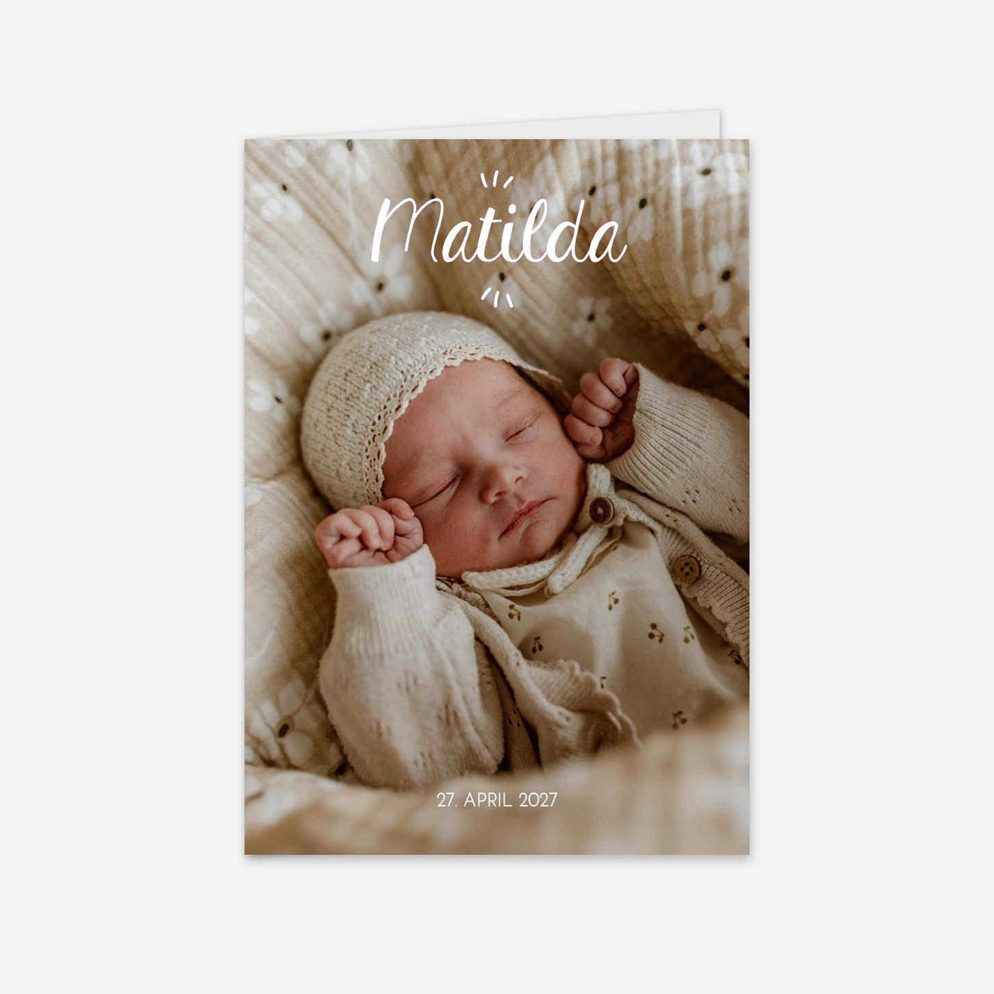 Mit der liebevoll gestalteten Geburtskarte "Strahlendes Wunder" verkünden Sie die Ankunft Ihres kleinen Wunders auf besonders stilvolle Weise. Die harmonische Gestaltung schafft eine zeitlose Erinnerung, die Familie und Freunde begeistern wird. Ideal für Eltern, die Wert auf Natürlichkeit und eine sanfte, moderne Ästhetik legen. Diese Geburtskarte verbindet Emotion, Stil und Persönlichkeit – perfekt, um die Freude über Ihr kleines Wunder mit Ihren Liebsten zu teilen.