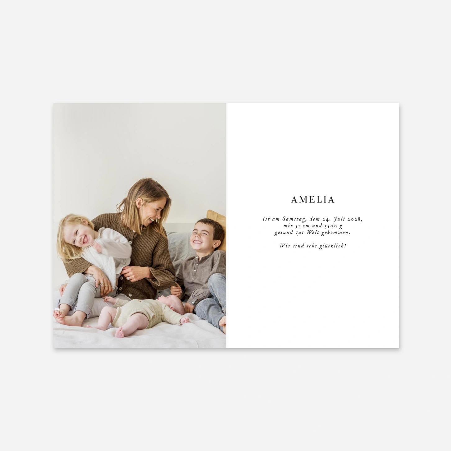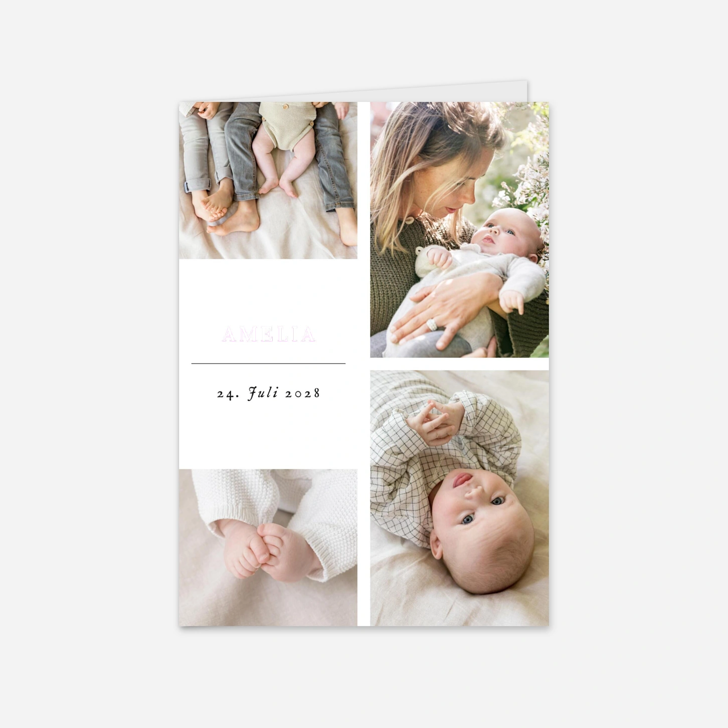 Verkünden Sie die frohe Botschaft an Ihre Freunde und Familie mit unserer Geburtskarte Sweet Moments. Unser hauseigenes Designteam Le Collectif hat ein raffiniertes Design entworfen, auf dem gleich fünf Fotos Ihres Babys Platz finden und die Geburtskarte so zu einem echten Hingucker macht. Auf der Vorderseite sind vier Fotos mit einem Textfeld zu einer Collage zusammengestellt. Klappen Ihre Liebsten die Geburtskarte auf, finden sie rechts ein schönes Foto groß in Szene gesetzt. Die linke Seite bietet Raum für einen kurzen Text an Ihre Liebsten. Auf der Rückseite können Sie Ihre Adresse hinterlegen. Natürlich können Sie die Schriftart und -größe in unserem Online-Editor nach Ihren Vorstellungen ganz einfach anpassen. Noch Fragen? Wenden Sie sich gerne an unseren freundlichen Kundenservice, der Ihnen per Mail, Live-Chat oder Telefon zur Verfügung steht.