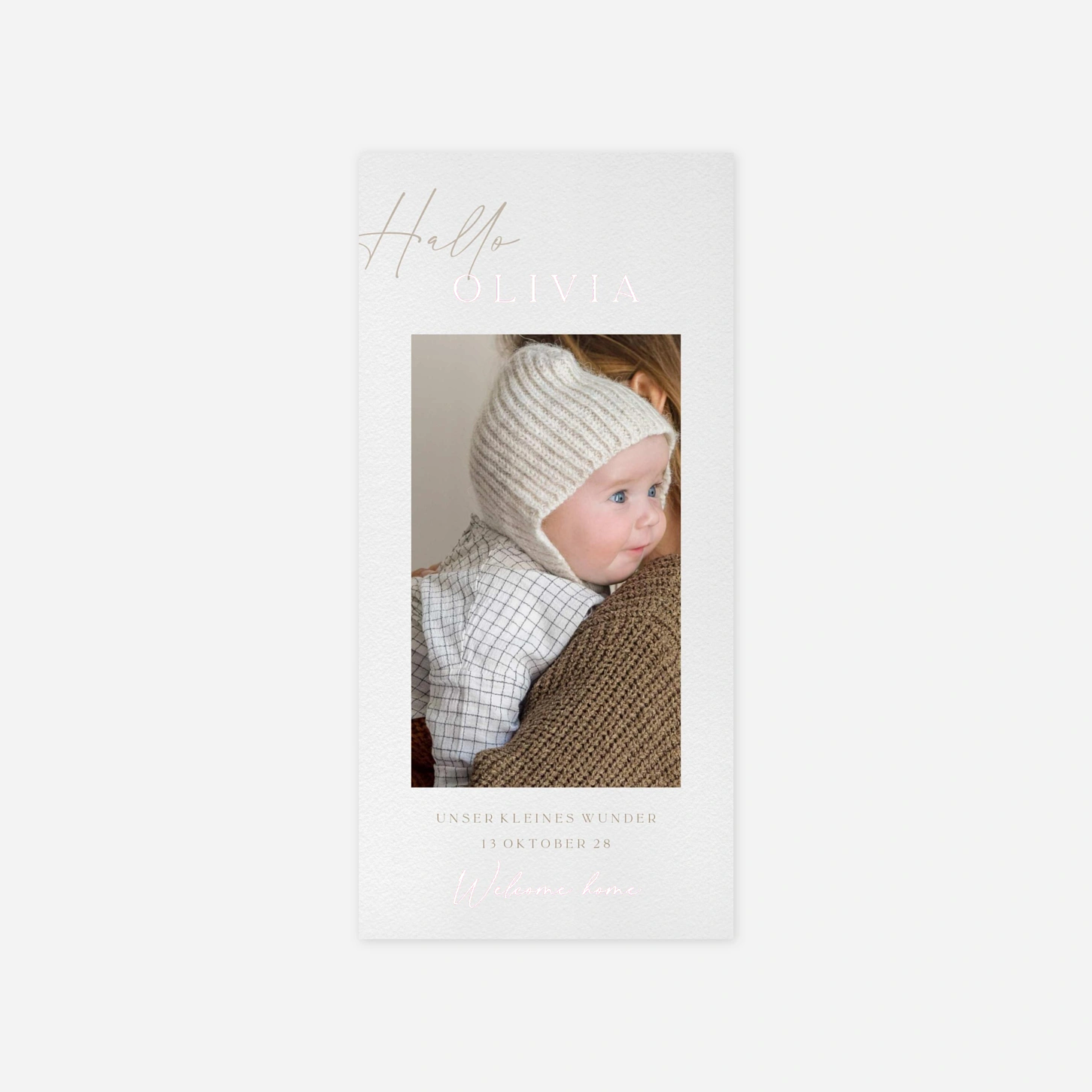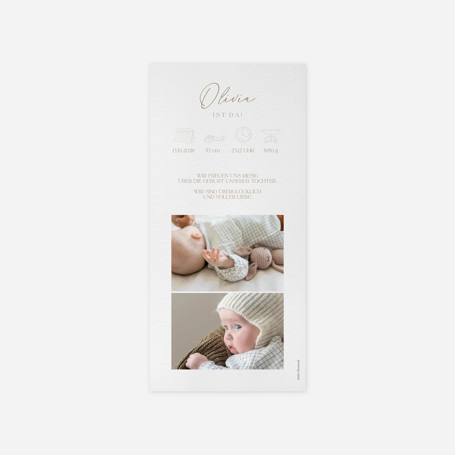Verkünden Sie die Ankunft Ihres Neugeborenen mit der Geburtskarte "Unser Herzglück", die durch ihre schlichte Eleganz und eine besonders liebevolle Gestaltung besticht. Das Design rückt ein herzliches Foto Ihres Babys in den Mittelpunkt und rahmt diesen besonderen Moment mit zarter, goldfarbener Typografie stilvoll ein. In unseren hauseigenen Ateliers entworfen, garantieren wir Ihnen eine hochwertige Qualität für Ihre persönliche Geburtskarte. Damit Ihre Papeterie perfekt wird, fertigen wir jede Karte mit größter Präzision in unserer eigenen Produktion in Deutschland oder Frankreich an. Nutzen Sie unser Angebot eines kostenlosen Probedrucks, um Ihre Geburtskarte gestalten zu lassen und sich vorab von der Premium-Qualität zu überzeugen.