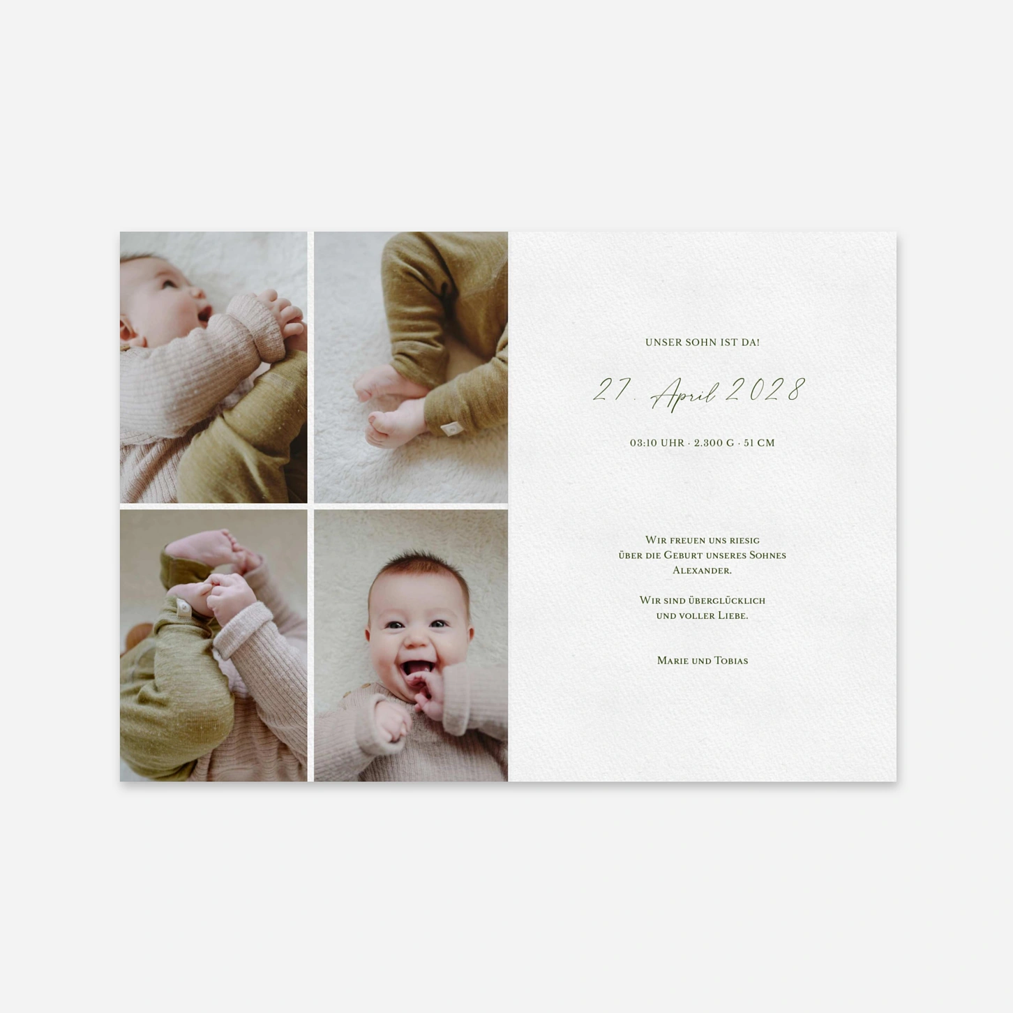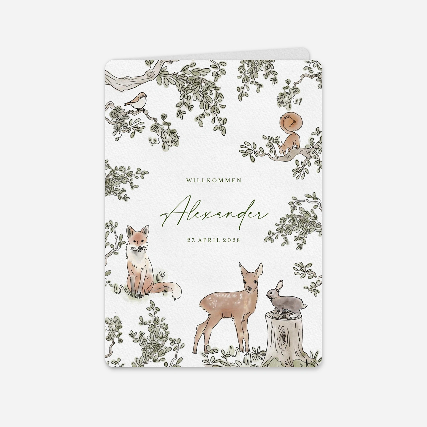 Die Geburtskarte „Waldflüstern“ erzählt die Ankunft Ihres Kindes mit liebevollen Illustrationen und einer ruhigen, poetischen Bildwelt. Sanfte Waldmotive und verspielte Details verleihen dieser Geburtskarte eine natürliche Wärme und schaffen Raum für Ihre persönlichen Worte und Fotos. Ideal für alle, die ihre Geburtskarte gestalten und dabei eine zeitlose, erzählerische Ästhetik wählen möchten. Gestaltet wird das Design von unserem hauseigenen Team und mit viel Sorgfalt in unseren eigenen Produktionsstätten gefertigt. Gut zu wissen: Für Geburtskarten erhalten Sie bei uns kostenlose Muster, um Ihr Lieblingsdesign ganz in Ruhe auszuwählen.