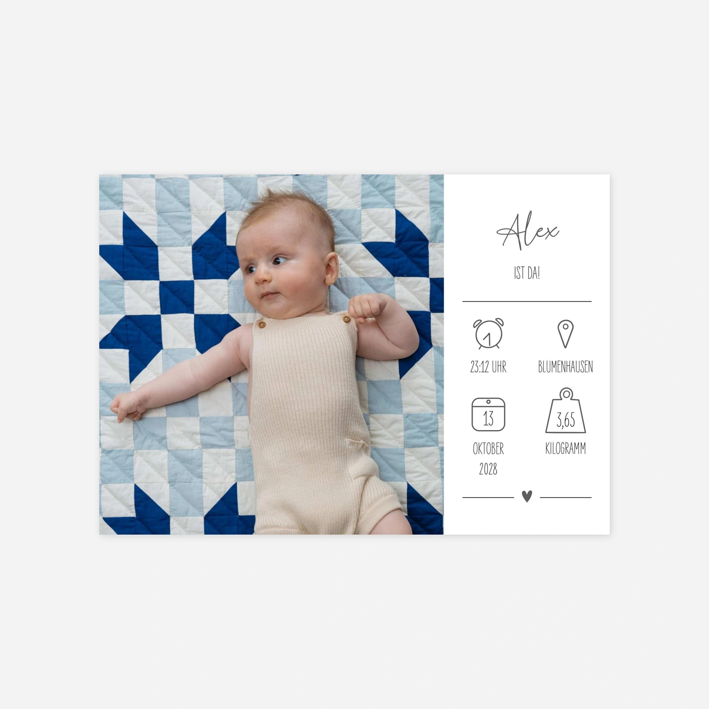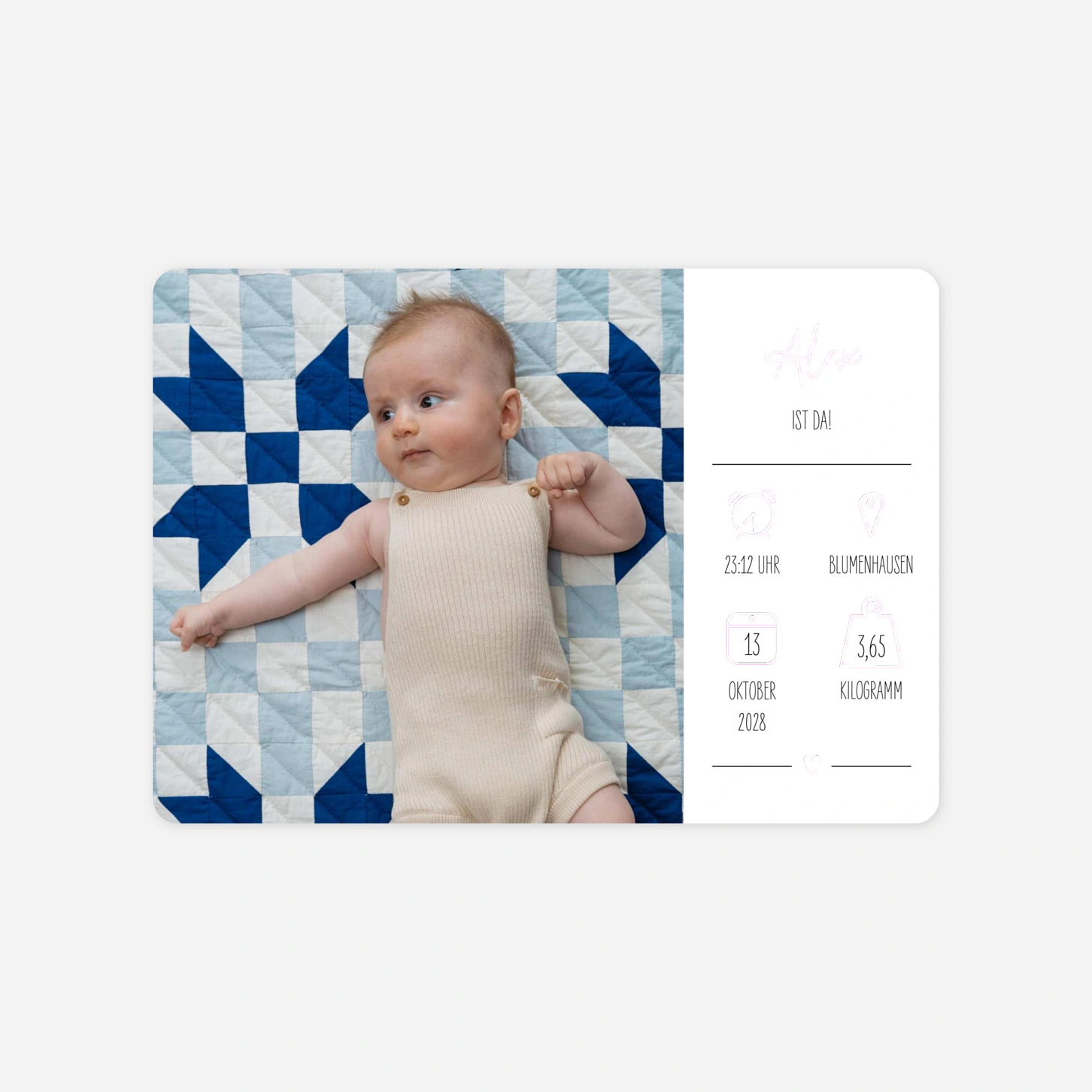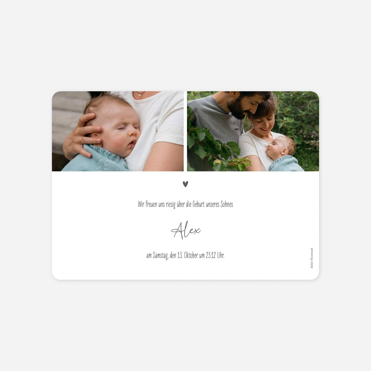 Die Geburtskarte "Wolkenkind" verbindet zarte Symbolik mit liebevoller Schlichtheit und bietet den perfekten Rahmen, um Ihr Baby der Welt vorzustellen. Persönliche Details wie Geburtszeit, Gewicht und Größe lassen sich auf charmante Weise einfügen und machen Ihre Karte einzigartig. Dank hochwertigem Druck und edlen Papieren erstrahlt jedes Foto in besonderer Qualität. Bestellen Sie jetzt Ihr kostenloses Musterpaket und gestalten Sie Ihre persönliche Geburtskarte online.