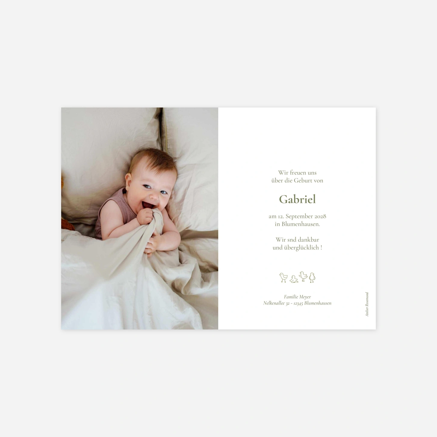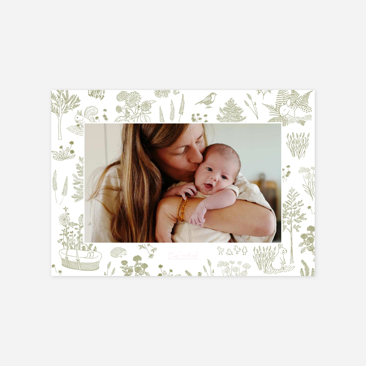 Die GeburtskarteZartes Reh schmückt sich mit zarten, von der Natur inspirierten Illustrationen. Feine Zeichnungen zeigen ein friedliches Reh, Vögel, ein Eichhörnchen und sogar einen kleinen Igel, umgeben von Blumen, Blättern und hohen Bäumen. So entsteht eine poetische, ländliche Szenerie – wie ein Spaziergang im Wald. Diese sanfte und raffinierte Atmosphäre hebt das Foto Ihres Babys liebevoll hervor.