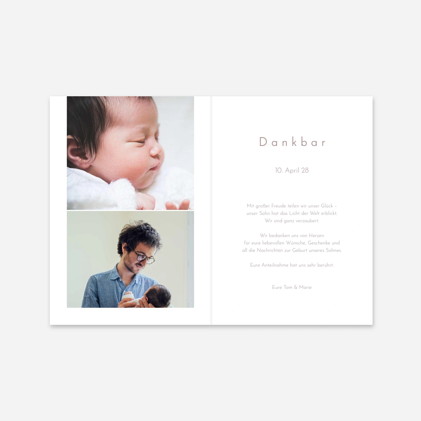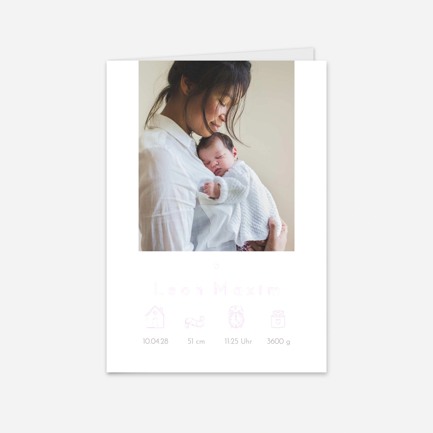 Die Geburtskarte "Zartes Willkommen" besticht durch ihr minimalistisches und dennoch herzliches Design, das den Fokus ganz auf das erste Foto Ihres Neugeborenen legt. Dank der liebevoll gestalteten Piktogramme lassen sich alle wichtigen Details wie Geburtsdatum, Uhrzeit, Gewicht und Größe stilvoll und übersichtlich präsentieren. In unserem hauseigenen Atelier achten wir bei jeder Karte auf höchste Druckqualität, damit Ihre besondere Botschaft perfekt zur Geltung kommt. Damit Sie sich von der Qualität unserer Papiere persönlich überzeugen können, bieten wir Ihnen gerne einen kostenlosen Probedruck an. Gestalten Sie Ihre individuelle Geburtskarte jetzt ganz einfach online in unserem Editor.