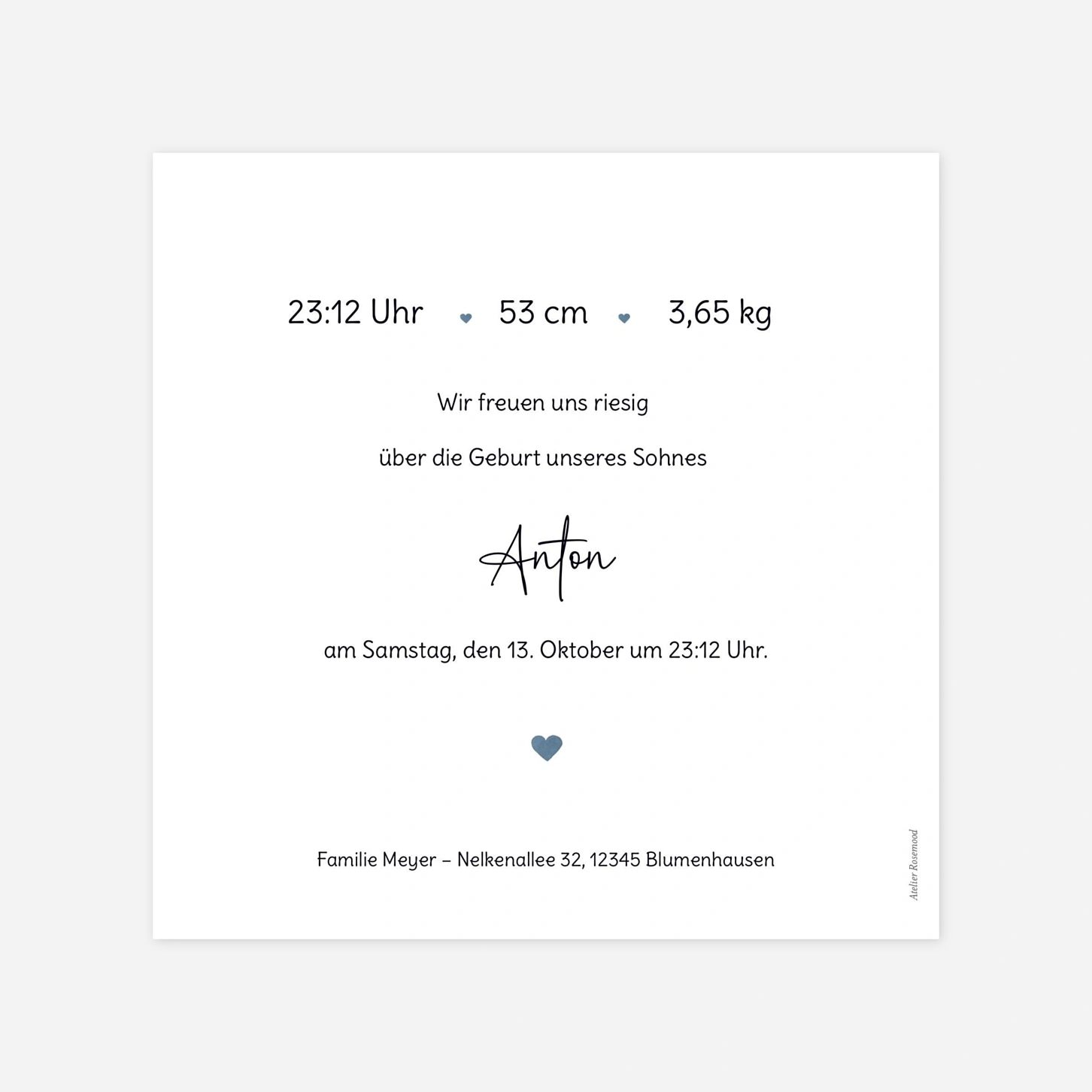 Die Geburtskarte "Zauberkind" ist eine liebevolle Möglichkeit, die Ankunft Ihres Babys mit Familie und Freunden zu teilen. Das zarte Design setzt das Foto Ihres kleinen Wunders besonders schön in Szene und gibt Raum für die wichtigsten Geburtsdetails. Mit unserem Online-Editor können Sie Ihre persönliche Geburtskarte gestalten und so eine ganz individuelle Erinnerung schaffen. Alle Karten werden in unseren eigenen Werkstätten in Deutschland und Frankreich mit großer Sorgfalt gedruckt. Fordern Sie gerne vorab ein kostenloses Musterexemplar an.