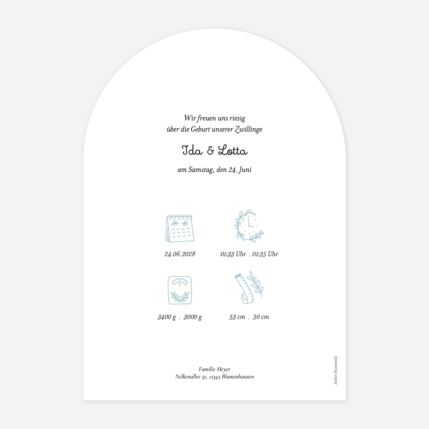 Die Geburtskarte "Zweifaches Glück" ist eine zauberhafte Möglichkeit, die Ankunft Ihrer Zwillinge stilvoll zu verkünden. Mit Platz für ein großes Foto und liebevollen Symbolen zu den Geburtsdetails wird jedes Detail Ihres besonderen Moments festgehalten. So entsteht eine persönliche Erinnerung, die Familie und Freunde berührt. Unsere Karten werden in unseren eigenen Werkstätten in Frankreich und Deutschland auf hochwertigem Papier gedruckt. Fordern Sie gerne ein kostenloses Muster an, bevor Sie Ihre Geburtskarte online gestalten.
