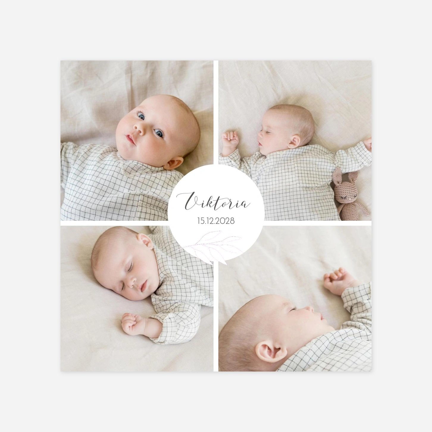 Nutzen Sie unser Geburtskarte Zweiglein (rund) und gestalten Sie Ihre ganz individuelle und wunderschöne Karte, um die Ankunft Ihres Babys auf der Welt zu feiern. Die zweiseitige Karte trägt eine moderne Collage, in welche Sie vier niedliche Bilder von Ihrem Baby einsetzen können. Ein weißer Kreis in der Mitte bricht die symmetrische Bildcollage und eignet sich perfekt, um den Namen Ihres Kindes zu verkünden. Der klare und moderne Stil der Karte ist reduziert und zurückhaltend, wodurch Ihr kleines Wunder besonders schön in den Vordergrund gestellt wird. Auf der Rückseite haben Sie ausreichend Platz, um Worte der Dankbarkeit und Freude an Ihre Familie und Freunde zu richten. Nutzen Sie hierfür die tollen Schriftarten, die wir in unserem Online Editor zur Verfügung stellen! Hier lässt sich die ganze Geburtskarte individuell anpassen und so nach Ihren Wünschen gestalten - das alles mit wenigen Klicks und völlig unkompliziert! Bei Unklarheiten und Fragen wird Ihnen unser freundlicher Kundenservice mit Rat und Tat zur Seite stehen.