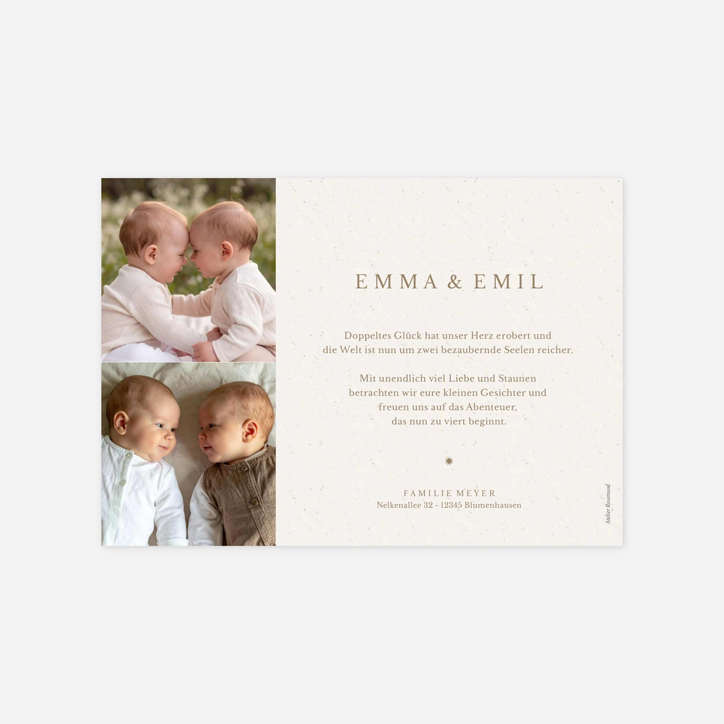 Die Geburtskarte "Zwillingswunder" feiert den doppelten Zauber des Lebens auf besonders stilvolle Weise. Mehrere Fotofelder geben Ihnen Raum, die schönsten Momente Ihrer beiden Babys liebevoll zu präsentieren. So entsteht eine persönliche und zugleich elegante Karte, die Familie und Freunde begeistert. Gedruckt wird Ihre Geburtskarte in unseren eigenen Werkstätten in Frankreich und Deutschland auf hochwertigem Papier. Bestellen Sie jetzt Ihr kostenloses Muster und gestalten Sie Ihr Unikat online.