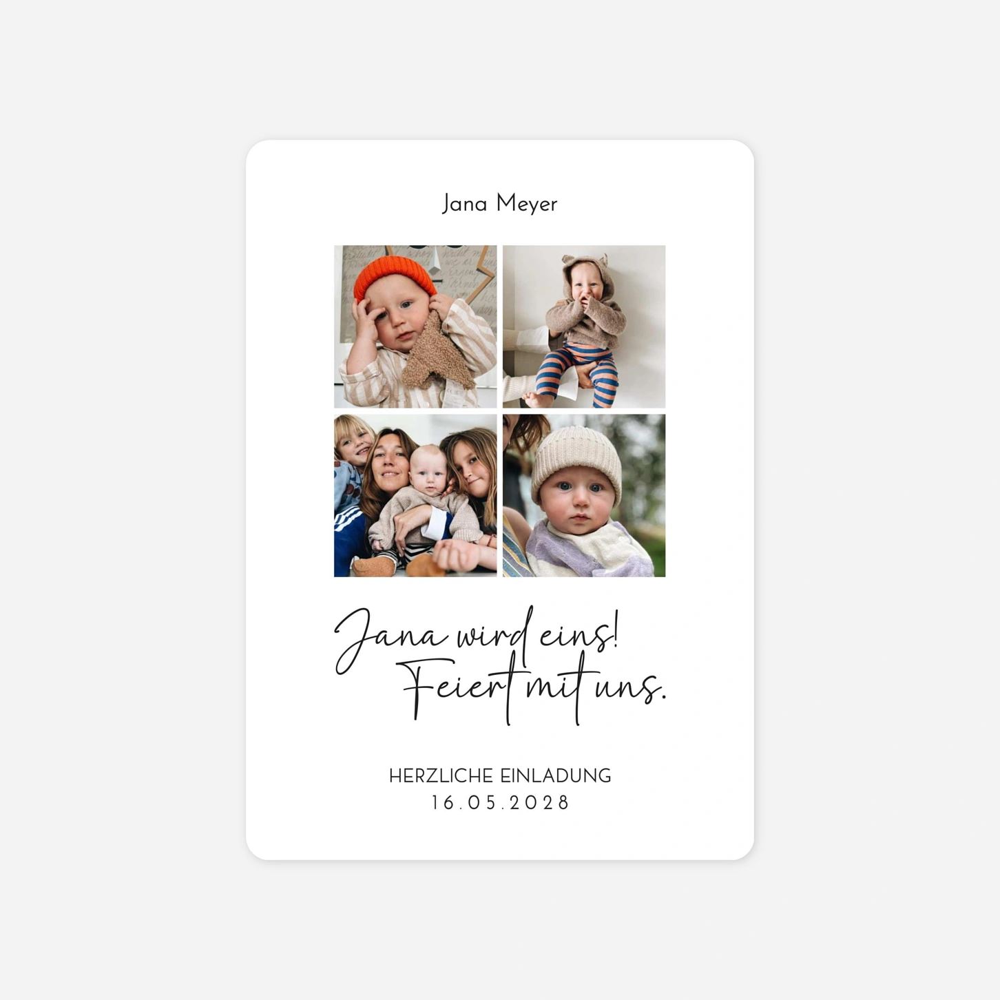 Die Kindergeburtstagseinladung "Erstes Glück" fängt die schönsten Momente des ersten Lebensjahres in einer liebevollen Fotocollage ein und lässt Ihre Familie und Freunde an diesem besonderen Meilenstein teilhaben. Mit ihrer modernen Typografie und dem herzlichen Design ist diese Einladung die ideale Wahl, um den ersten Geburtstag Ihrer Tochter gebührend anzukündigen. Alle unsere Karten werden mit größter Sorgfalt in unseren eigenen Ateliers gedruckt, um Ihnen eine exzellente Druckqualität für Ihre wertvollsten Erinnerungen zu garantieren. Gestalten Sie diese persönliche Einladung zum Kindergeburtstag ganz einfach online und freuen Sie sich auf ein unvergessliches Fest.